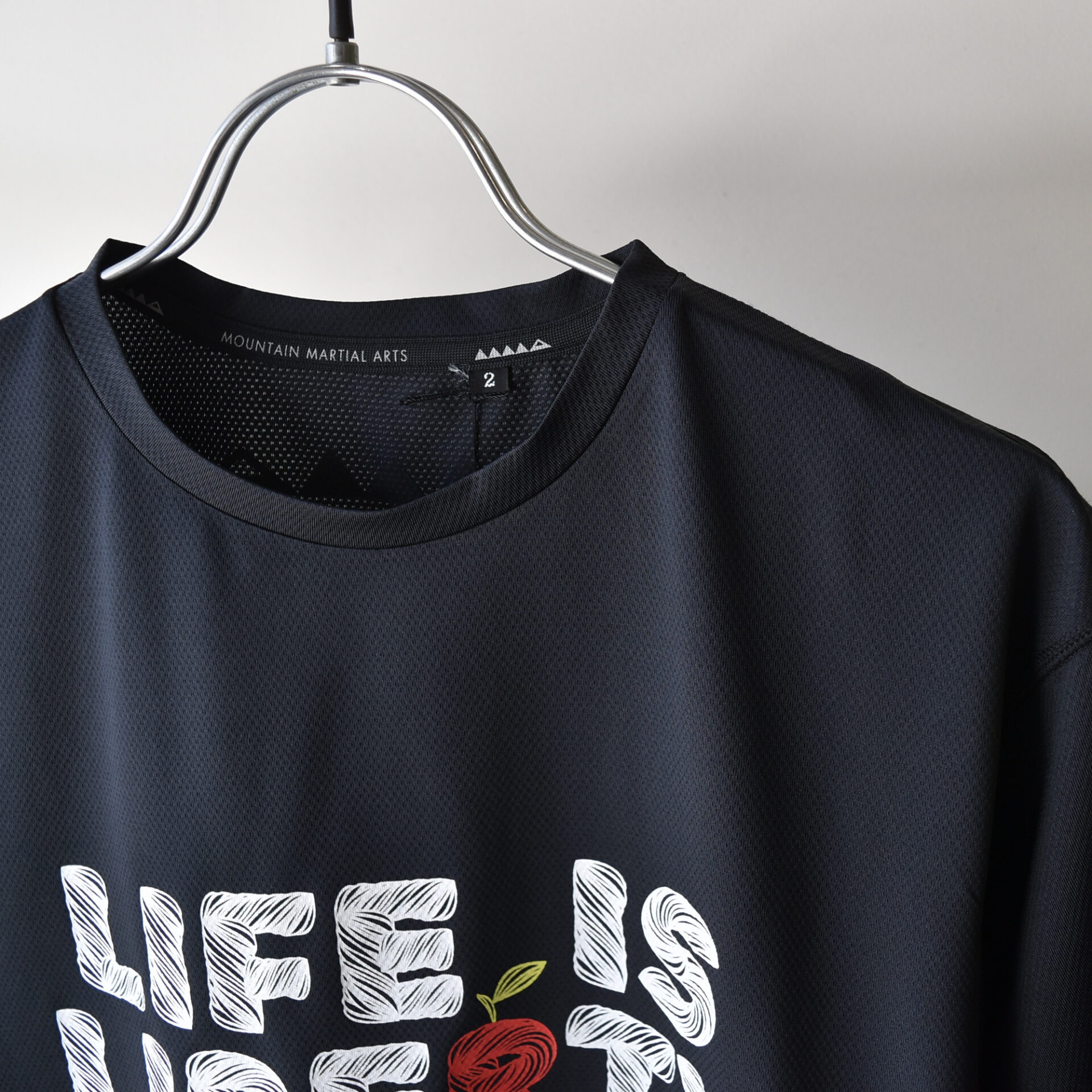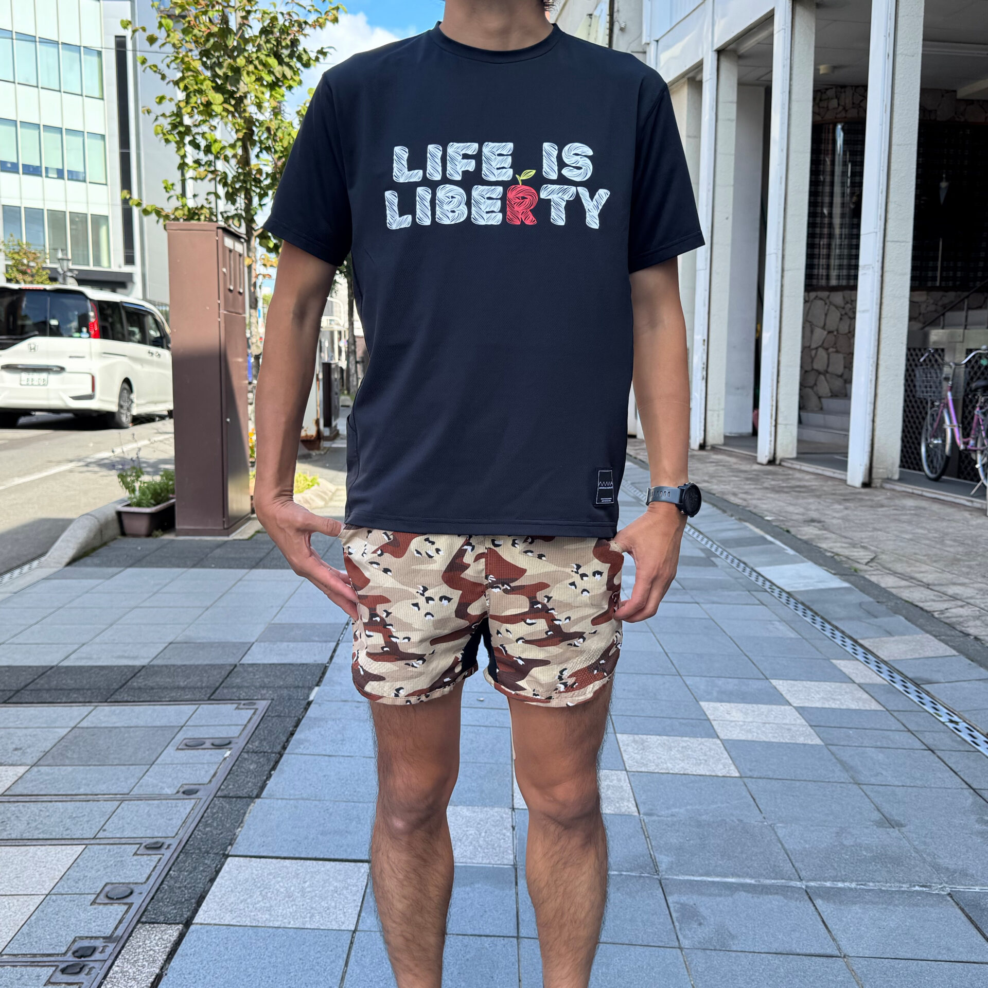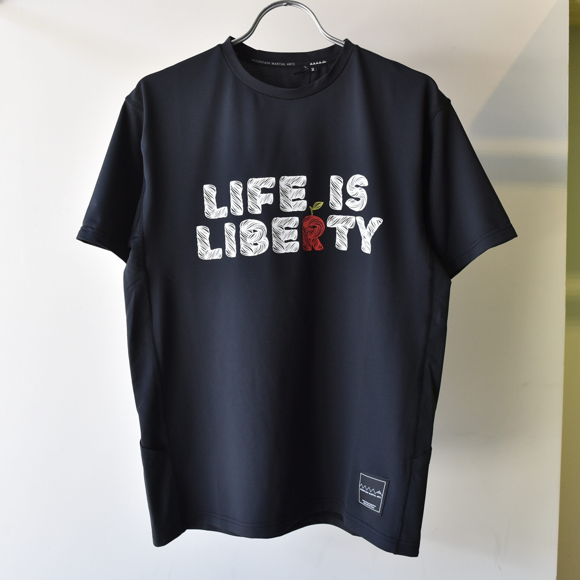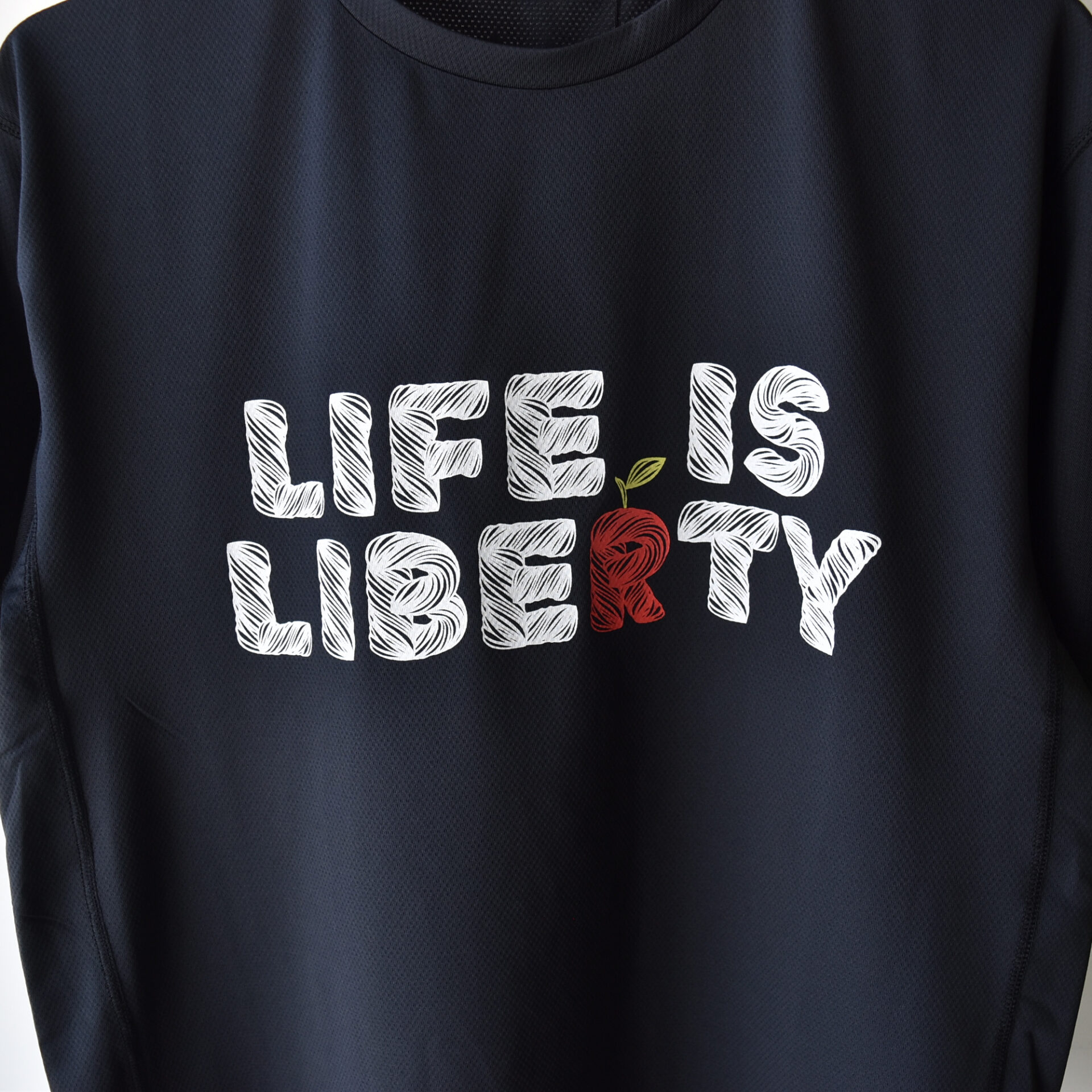 こわだ君の座右の銘「LIFE IS LIBERTY」にりんごのモチーフを組み合わせたメッセージTシャツ。