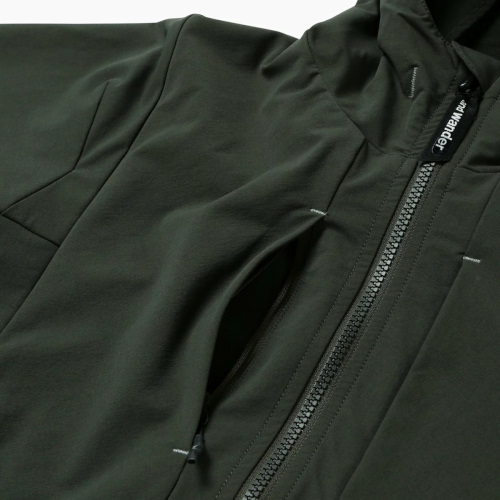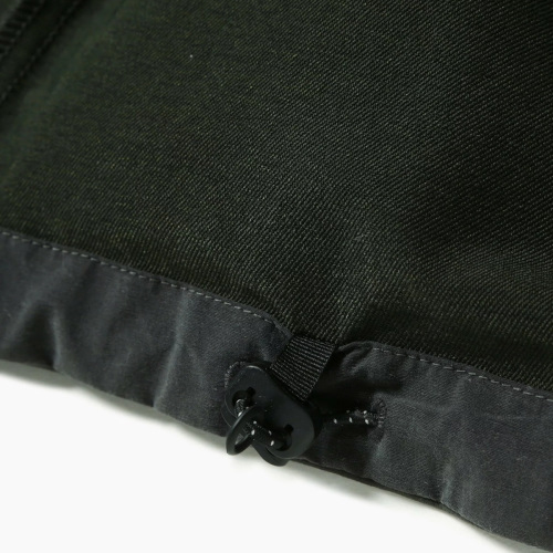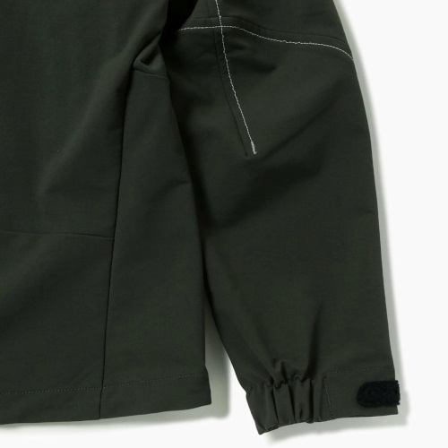 表側にナイロン、裏側にポリエステルを使用した2重織構造の生地で4WAYストレッチが特徴です。 撥水加工を施しています。 リフレクターステッチを使用しています。