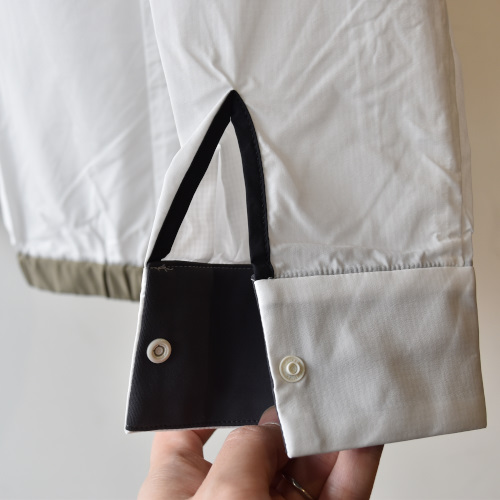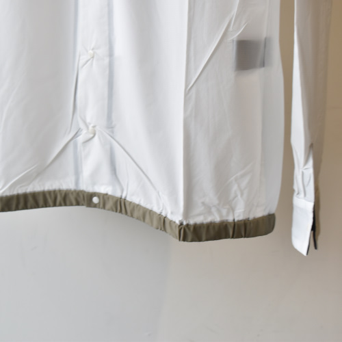 ・見返しパイピングで補強。裾ギャザー別地使用で補強。とにかく素材が軽いので、軽すぎない ことにこだわり、風受け時のめくれに対応した仕立てとしました。