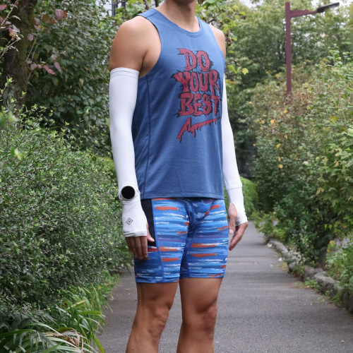 サムホール付きで手の甲まで覆えるタイプのアームウォーマーは、寒冷時のトレーニングやレースで非常に便利なアイテムです。