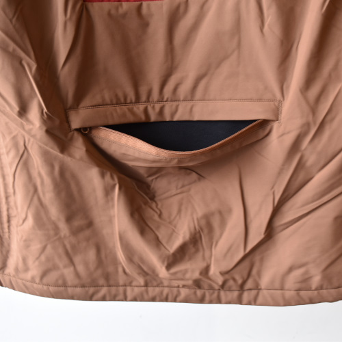 後身頃の裾に配置したジップ付きポケットは、小物の収納に便利なだけではなく、小さく畳んでバックポケットに収納出来るパッカブル仕様に設計しているので、携帯にも便利なアイテムとなっています。
