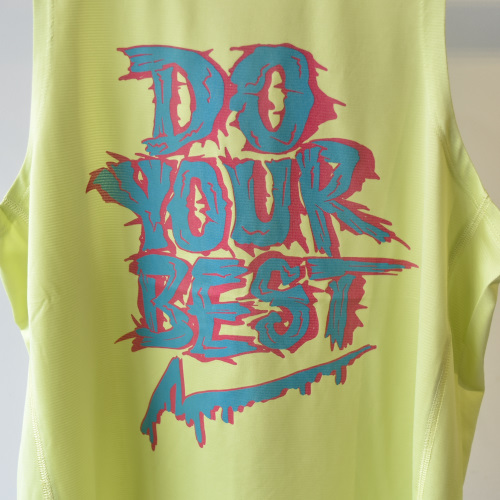 フロントにランナーを鼓舞するワードを落とし込んだグラフィックをプリントしたランニングシャツです。