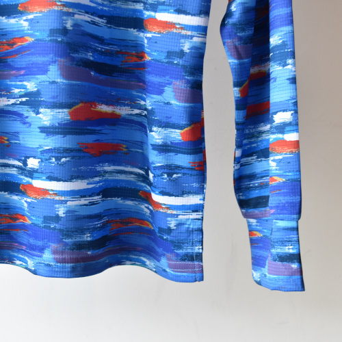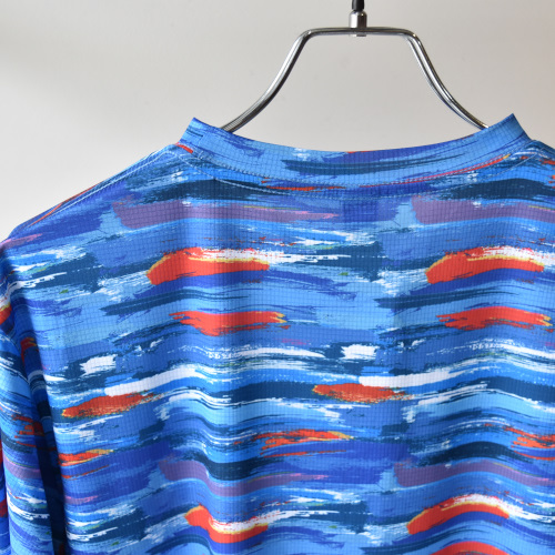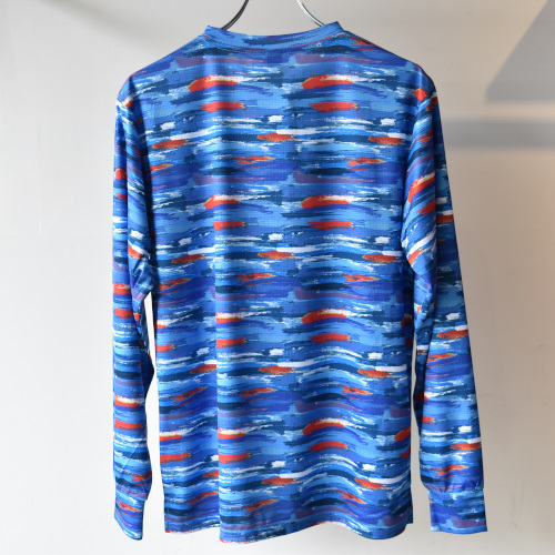 ペイントタッチなマルチボーダーをイメージして作成した色鮮やかで緻密なグラフィックを、昇華転写プリントで表現したオリジナルテキスタイルを使用して制作した、長袖のランニングシャツです。