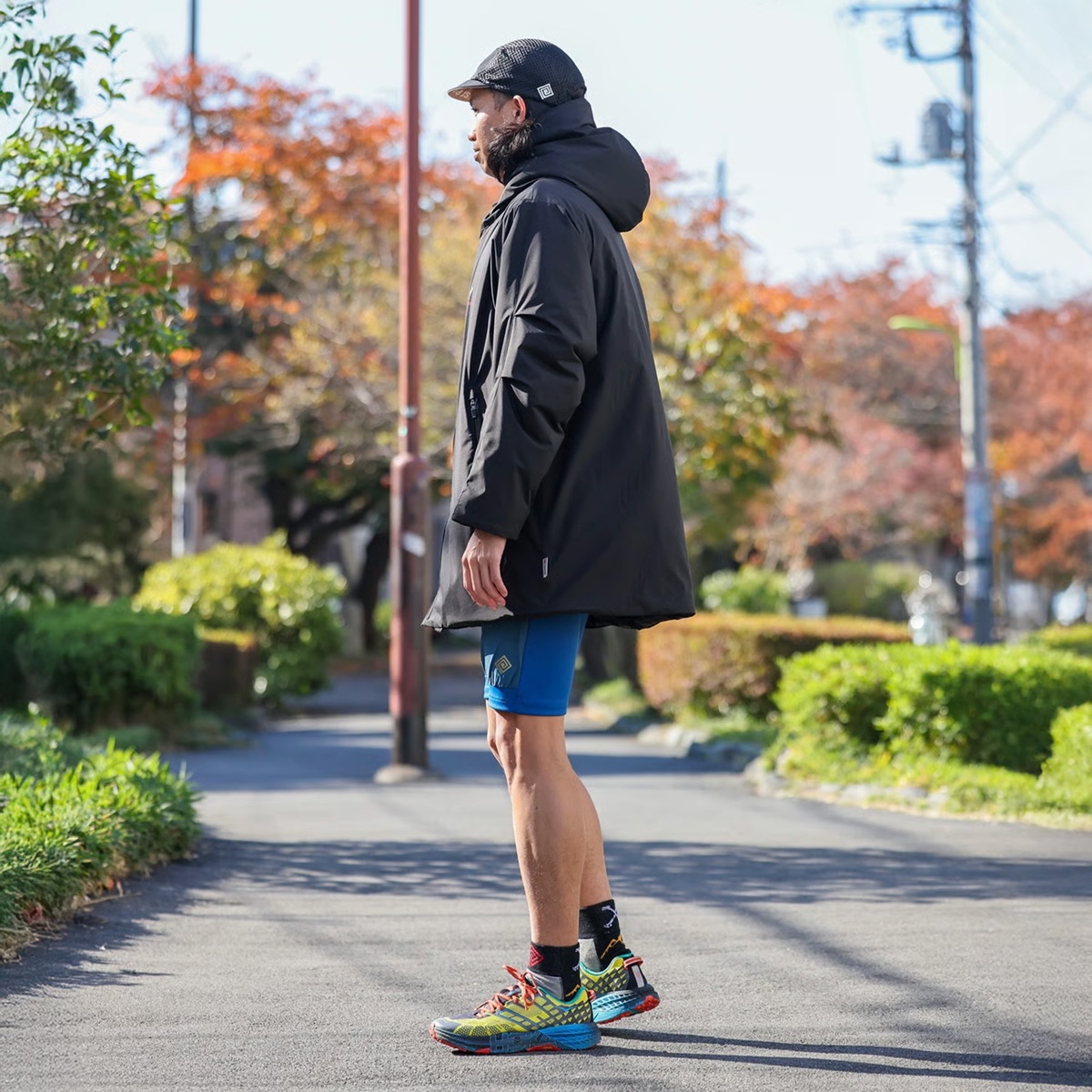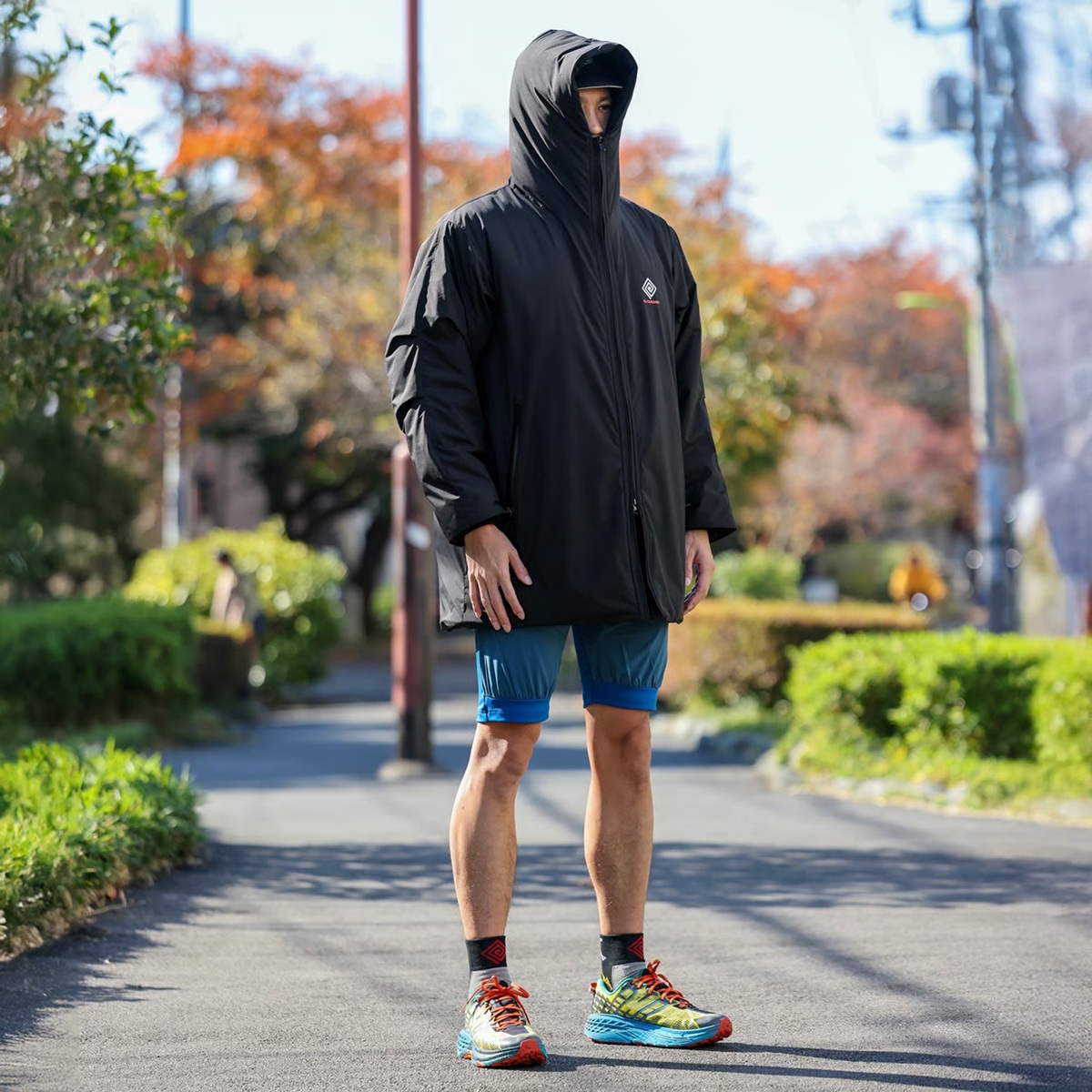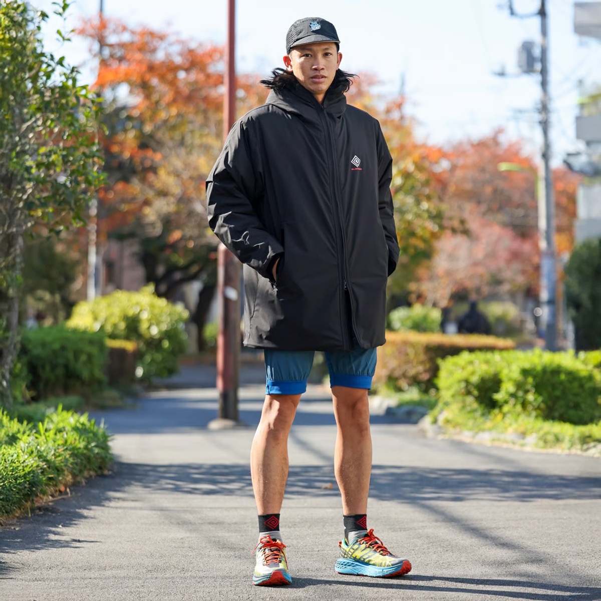 寒冷時のレースやトレーニング前後、ウォーミングアップ時などに、ウェアの上からざっくりと羽織れる、ミリタリーアイテムから着想を得たリラックスフィットの中綿入りジャケットの新作。