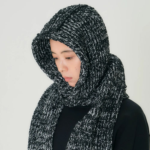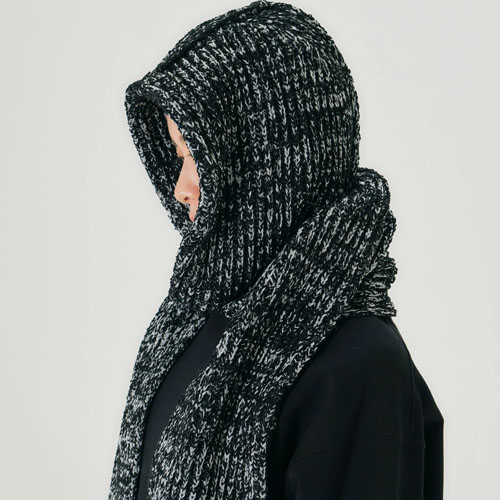 緩く畦編みにしたポリエステルニットを大胆に使用したロングフードマフラー!編地を切り替えて頭のカーブに合わて奇麗なシルエットを作っています。垂らしても巻いても様々なバリエーションで着用可能!