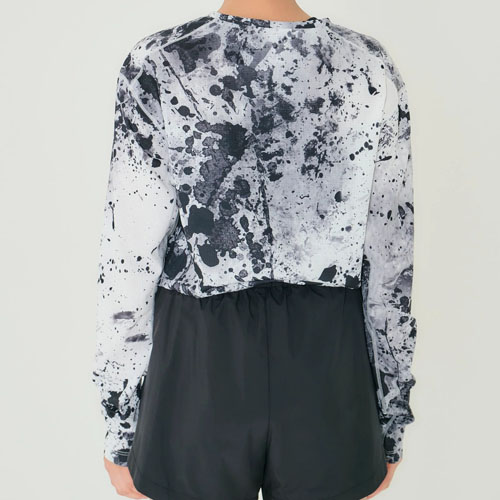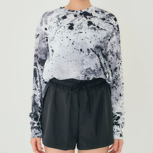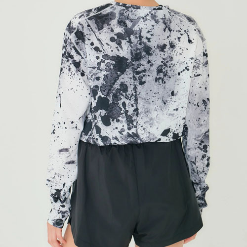 Ultra lightドットエア素材を採用。肌当たりの良い独特の質感と高機能の速乾性を併せ持ちます。脇下のクロスしたサイドシームが象徴的なデザイン。また、運動機能があり腕の可動域を広げやすくする効果があります。袖口には手の甲まで覆うデザイン性のあるサムホールを配置しました。 白黒は日本の書道からインスピレーションされたオリジナルのグラフィック、モスは背面に菊の花のオリジナルグラフィックとなっています。