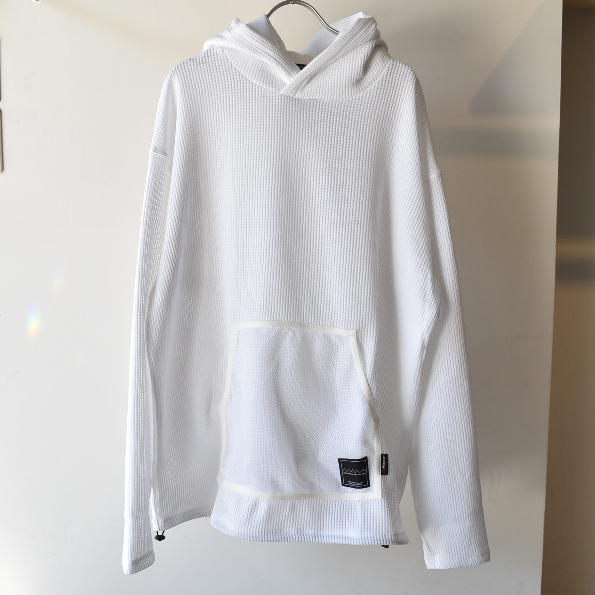 小物入れとして使えるメッシュのカンガルーポケットは機能的であると共にデザインのアクセント。