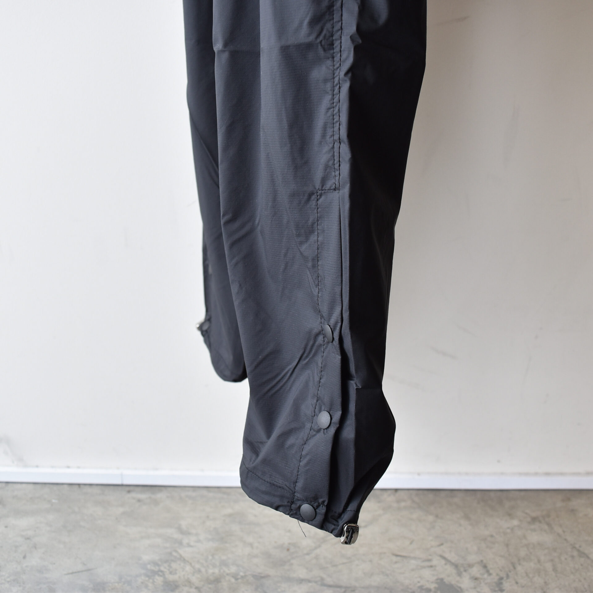 裾はドットボタンで開閉し、シューズを履いたままでも着用可能。