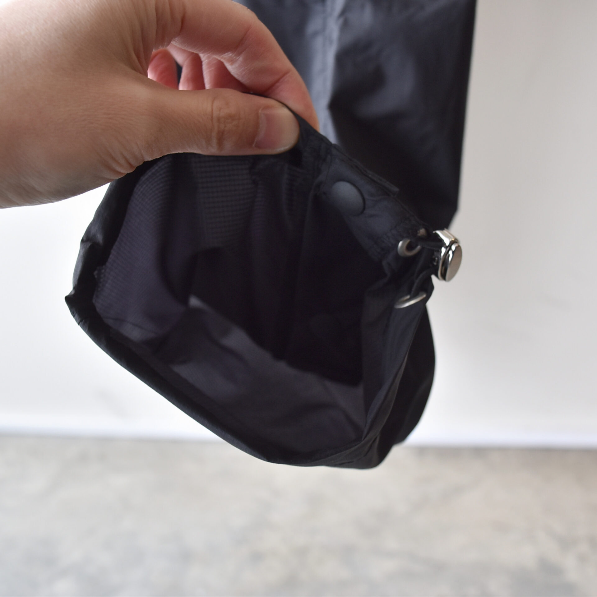 必要最低限な 4 つのポケットを備え、背部腰部のファスナー付きポケットに収納することでパッカブルになる。
