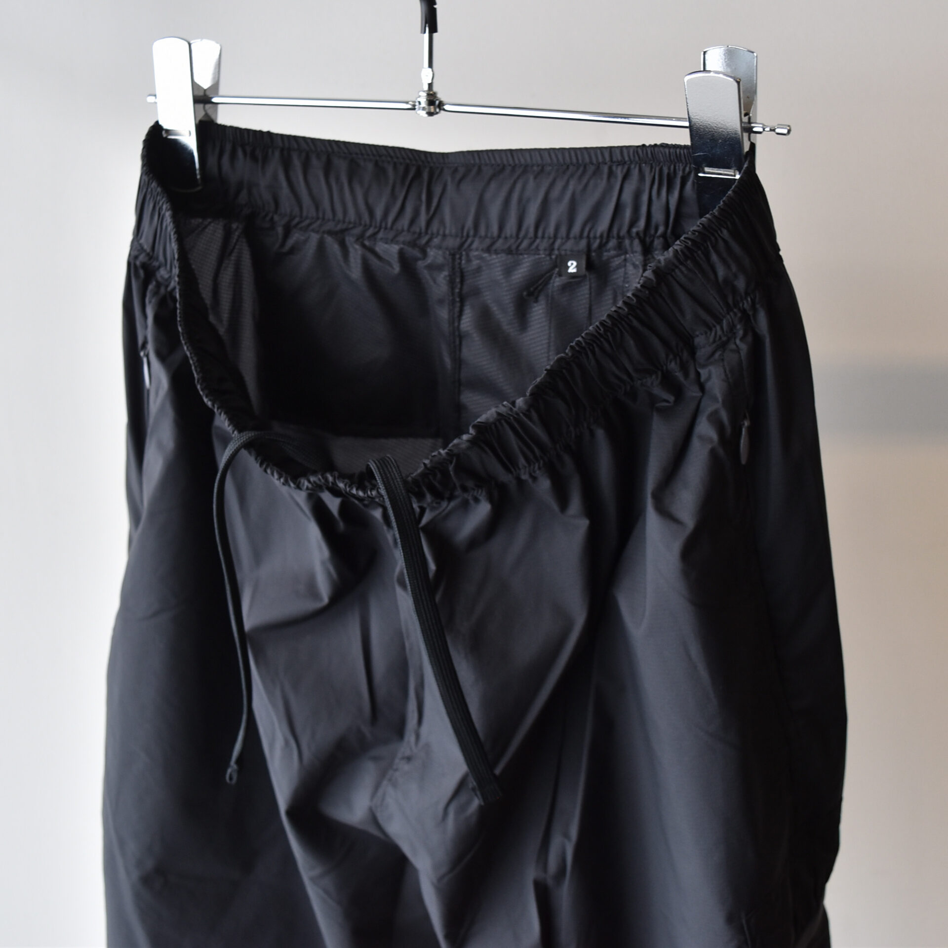 ウエストはゴム + 紐、裾はドローコードでフィット感を調整できる。