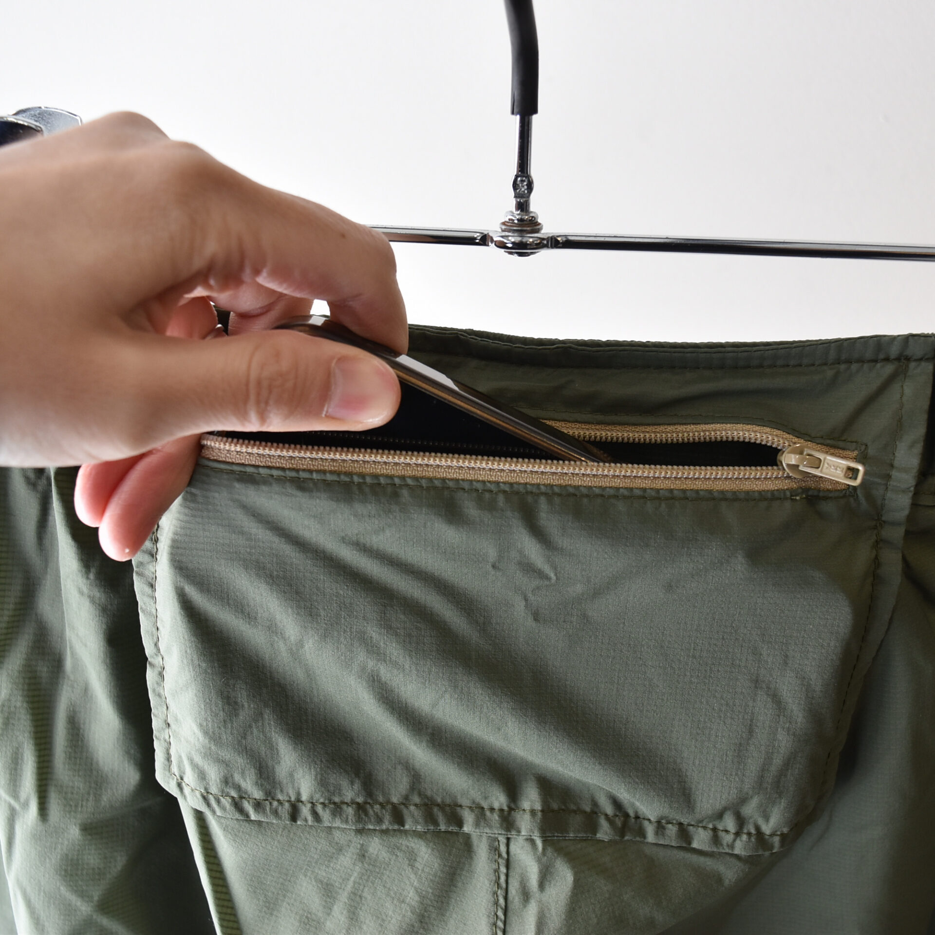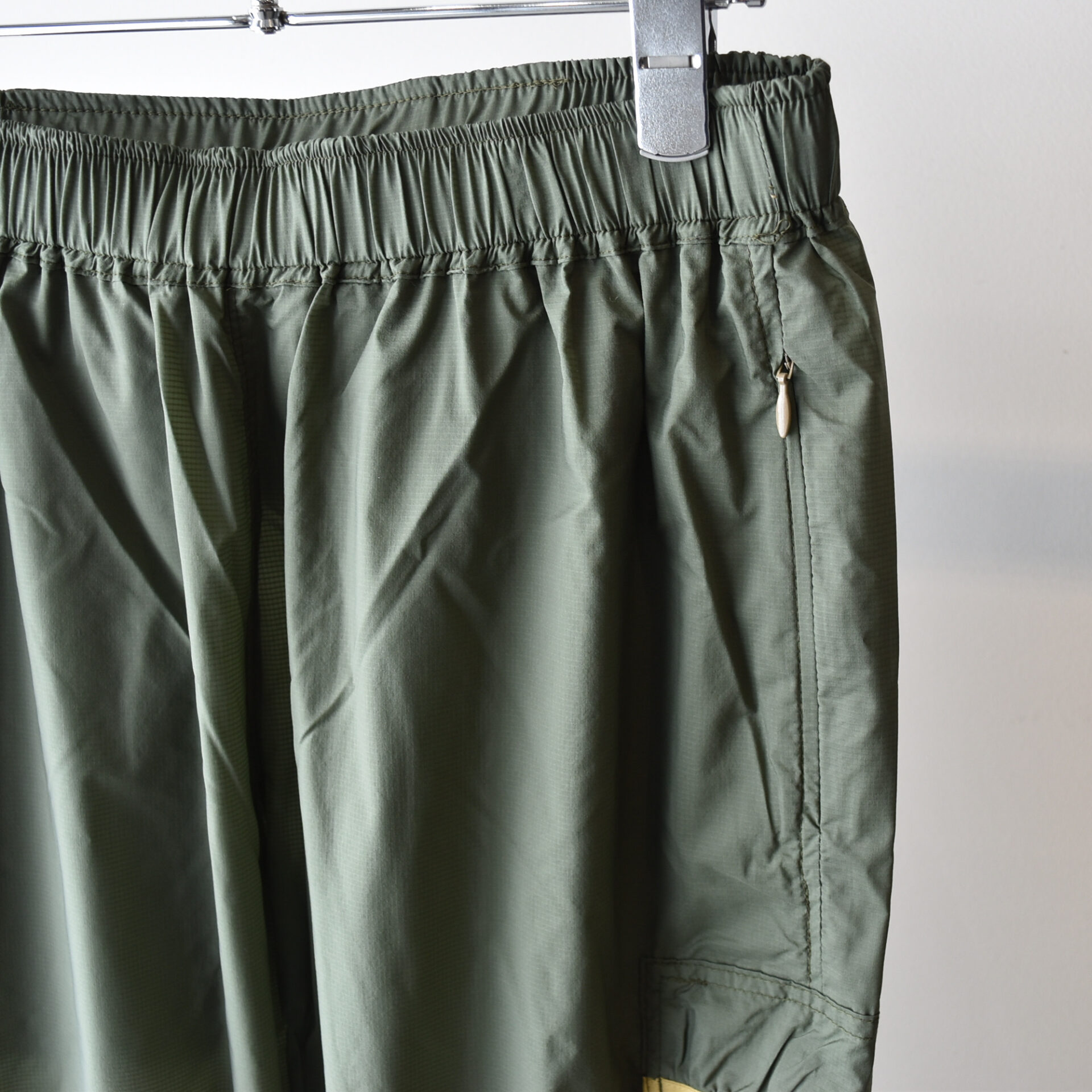 必要最低限な 4 つのポケットを備え、背部腰部のファスナー付きポケットに収納することでパッカブルになる。