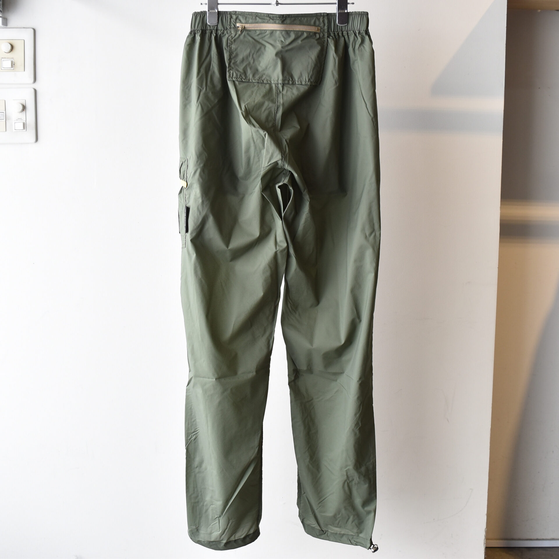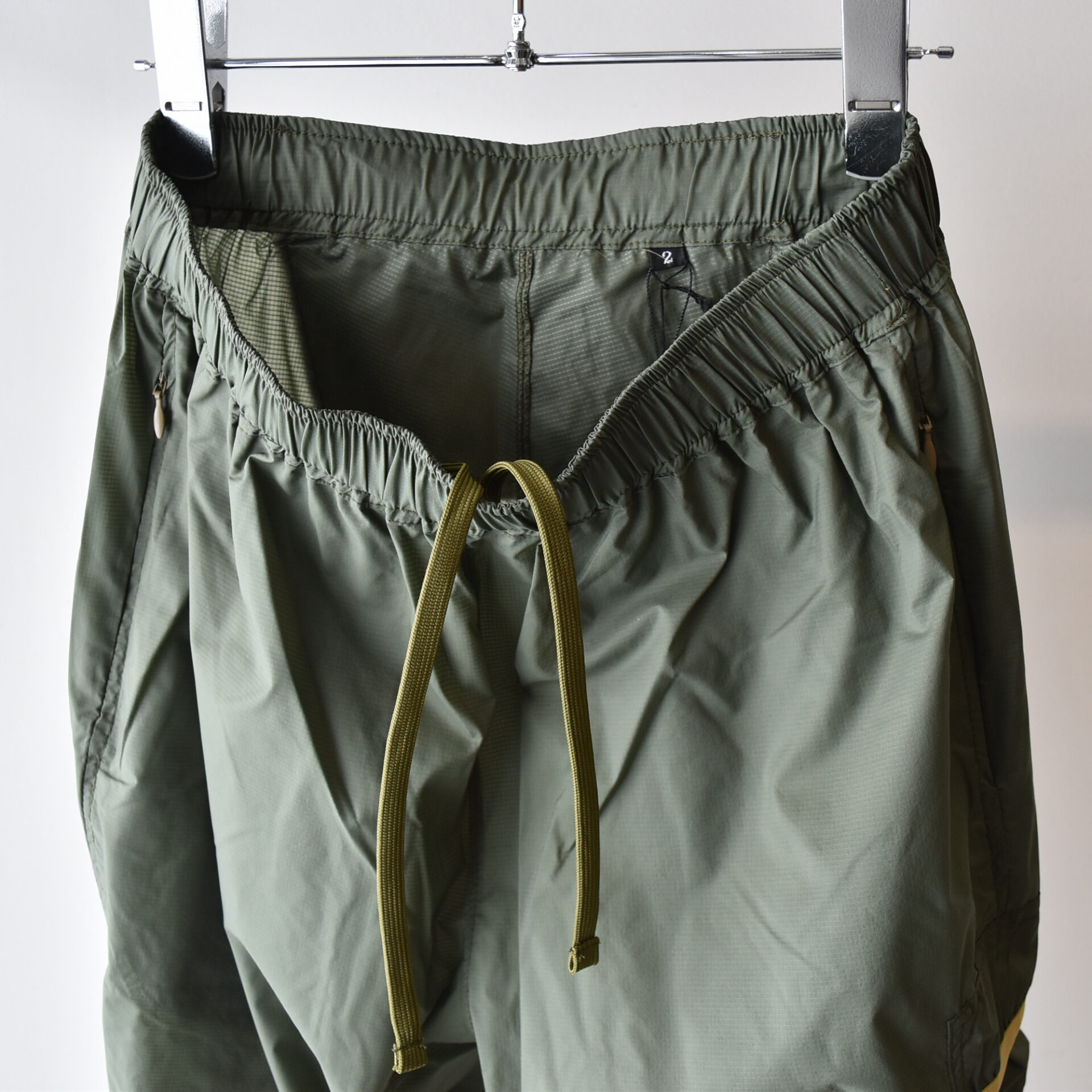 ウエストはゴム + 紐、裾はドローコードでフィット感を調整できる。