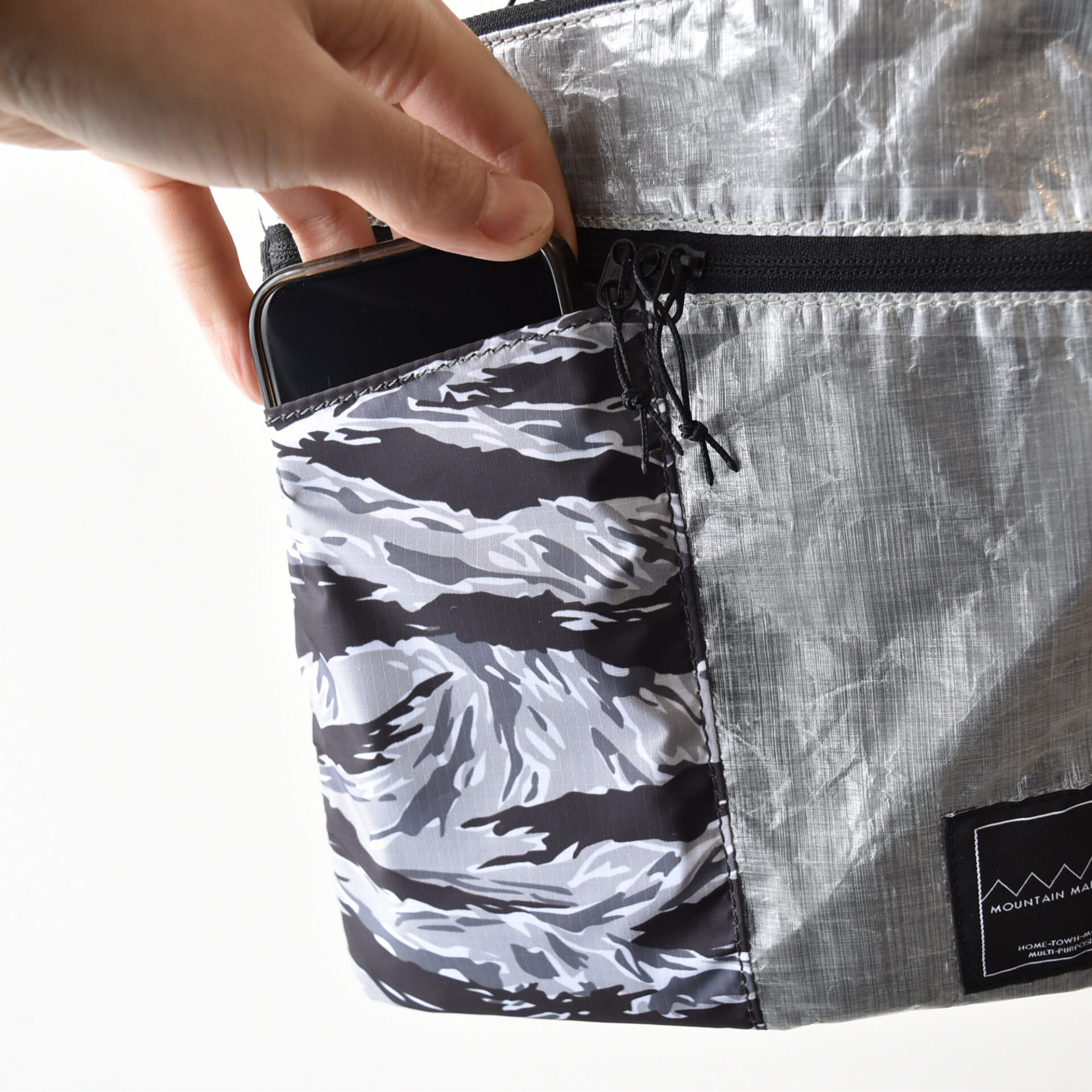 表面は DCF(Dyneema®Composite Fabric)、前面ポケットと背面は撥水加工を施した軽量リップストップにタイガーカモを昇華転写プリント。