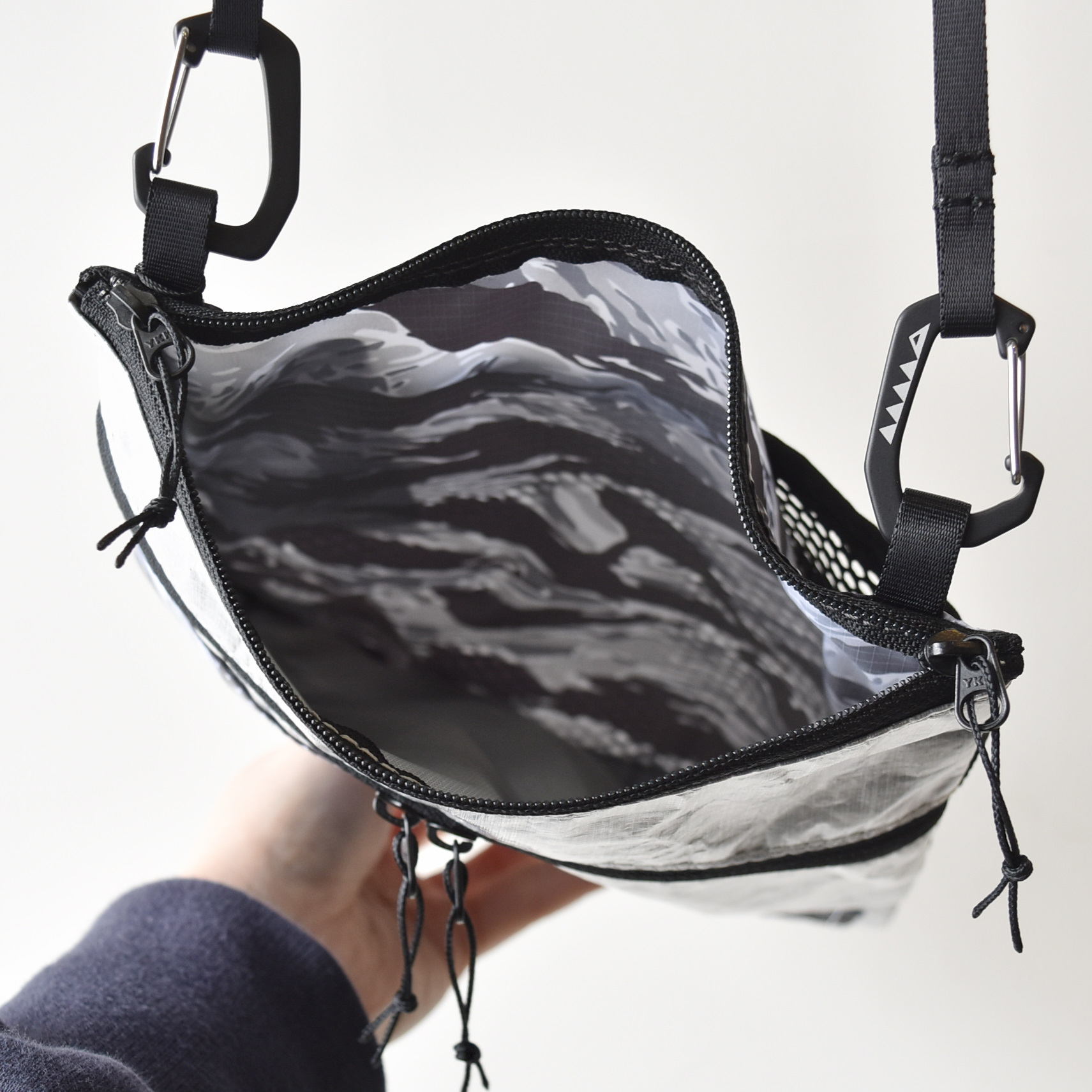 軽量ながら驚くほど高い強度と防水機能を持つ世界最強の繊維と言われる DCF(Dyneema® Composite Fabric)と カモ柄を組み合わせたデザインが特徴的な軽量サコッシュ。 豊富なポケットと軽量さでタウンユースからハイクまで活躍する。