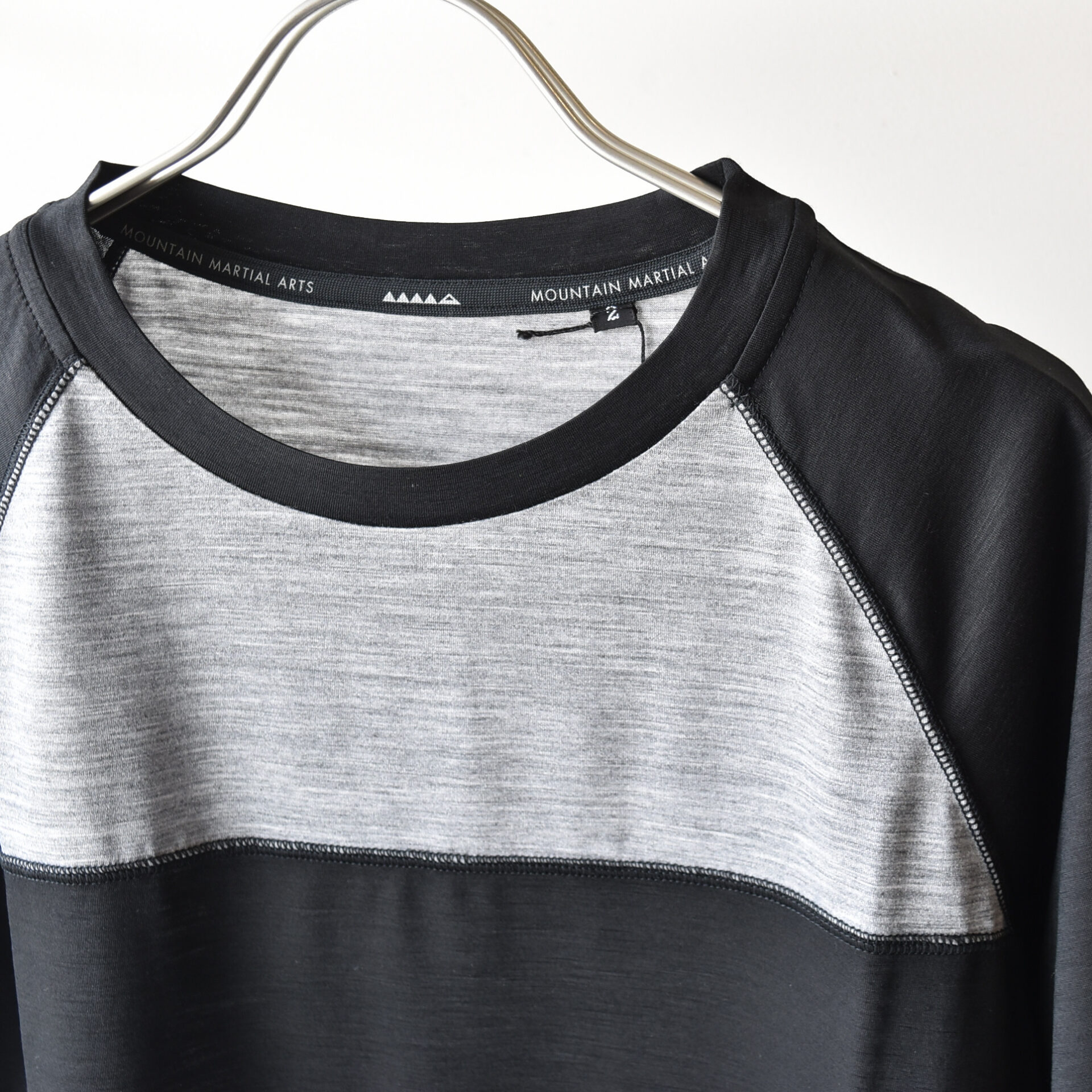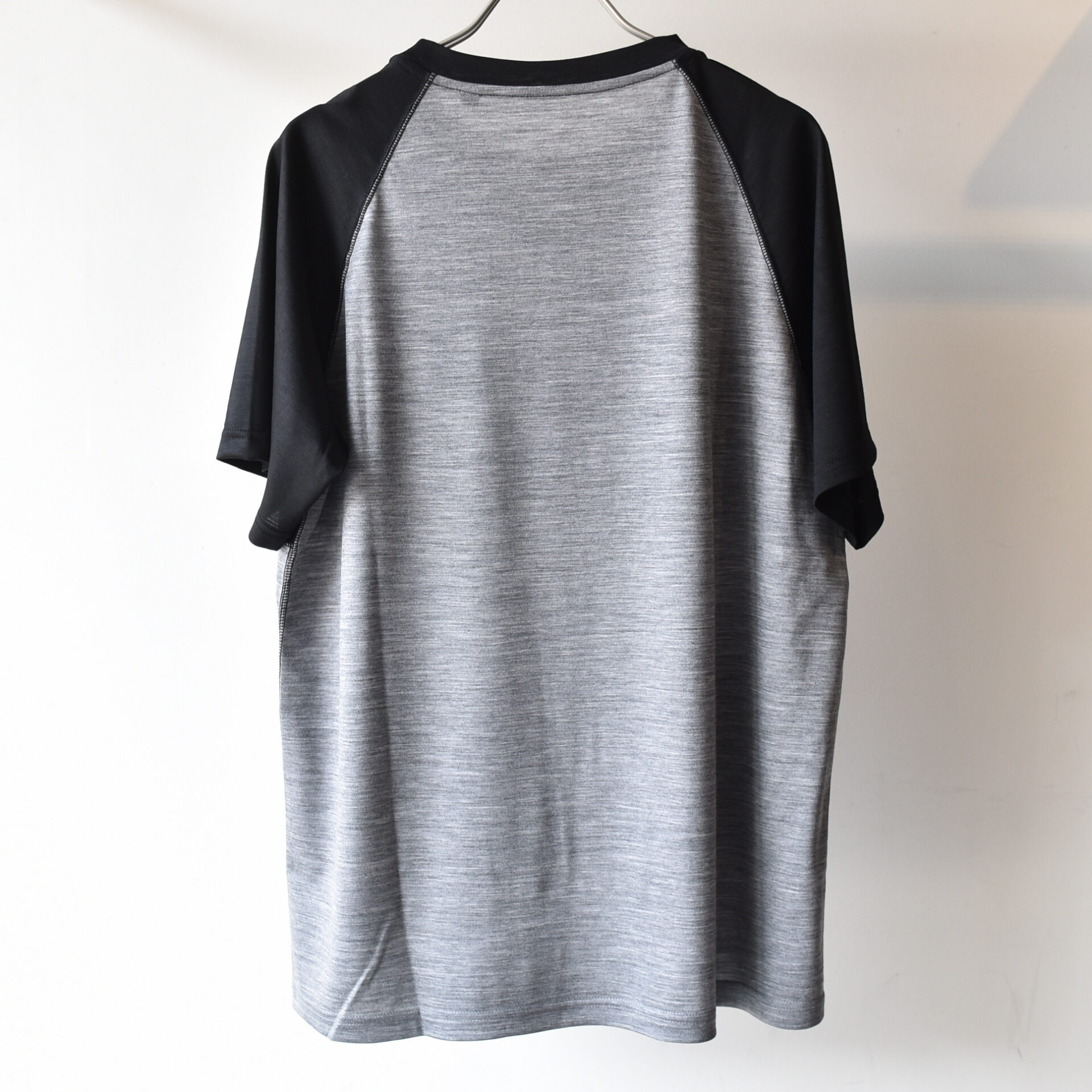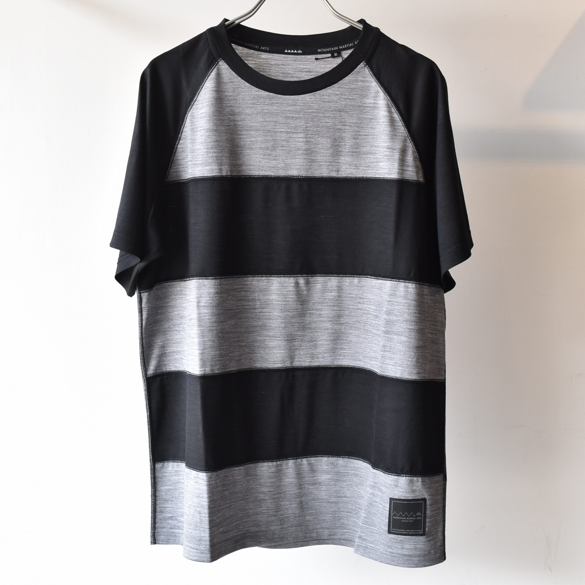 2 色のメリノウールを切り替えてボーダーを表現したラグランスリーブ T シャツ。