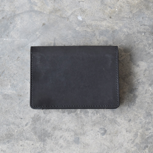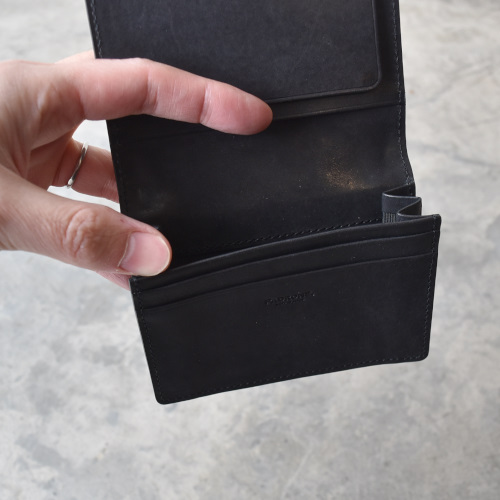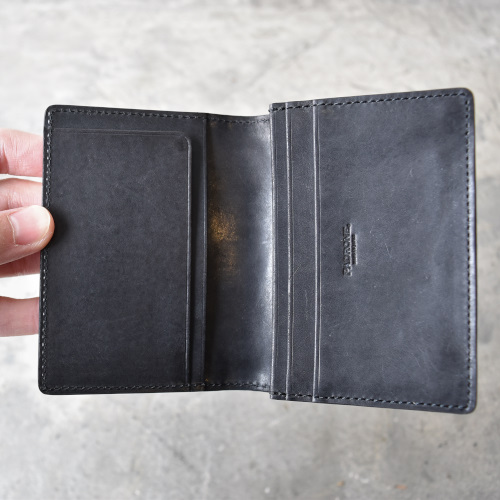 国産のモストロレザーを使用。 植物タンニンなめしのヌメ革を染料で染めた後、一枚一枚手塗りでワックスを塗り込み仕上げています。 使い始めは表面が白っぽく、徐々に表面のワックスが革の内部に染み込み、輝くほどの艶が出てくると同時に手触りもなめらかになってきます。