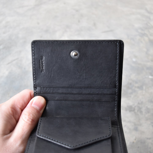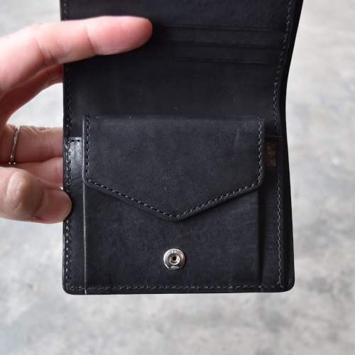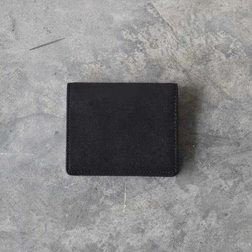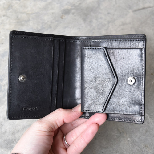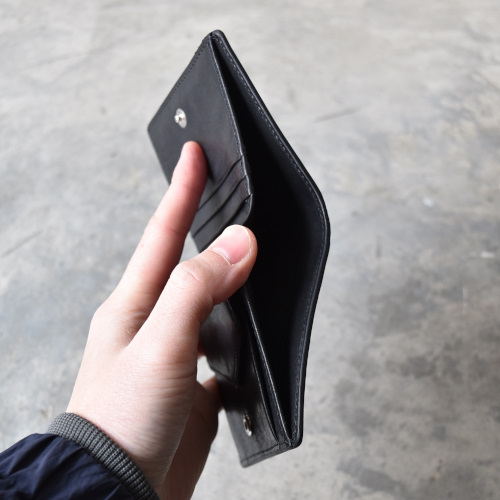 国産のモストロレザーを使用。 植物タンニンなめしのヌメ革を染料で染めた後、一枚一枚手塗りでワックスを塗り込み仕上げています。 使い始めは表面が白っぽく、徐々に表面のワックスが革の内部に染み込み、輝くほどの艶が出てくると同時に手触りもなめらかになってきます。