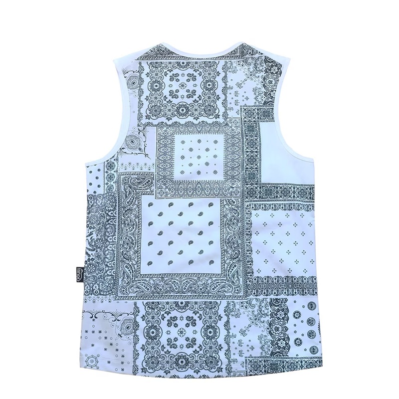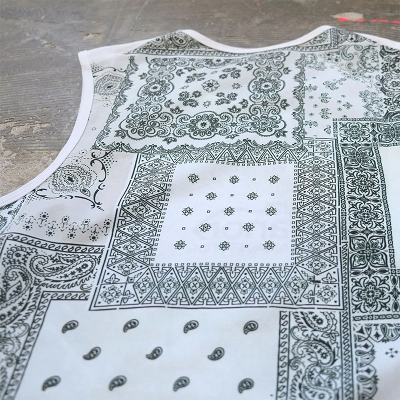 数種類のビンテージバンダナのエイジングを生かしパッチワークをデータ化プリントしたバンダナノースリーブです。 前身頃はプライムフレックス・後ろ身頃はメッシュ素材を使用しております。 プリント部分に擦れ等ございますがビンテージバンダナのエイジングをそのままプリントしております。