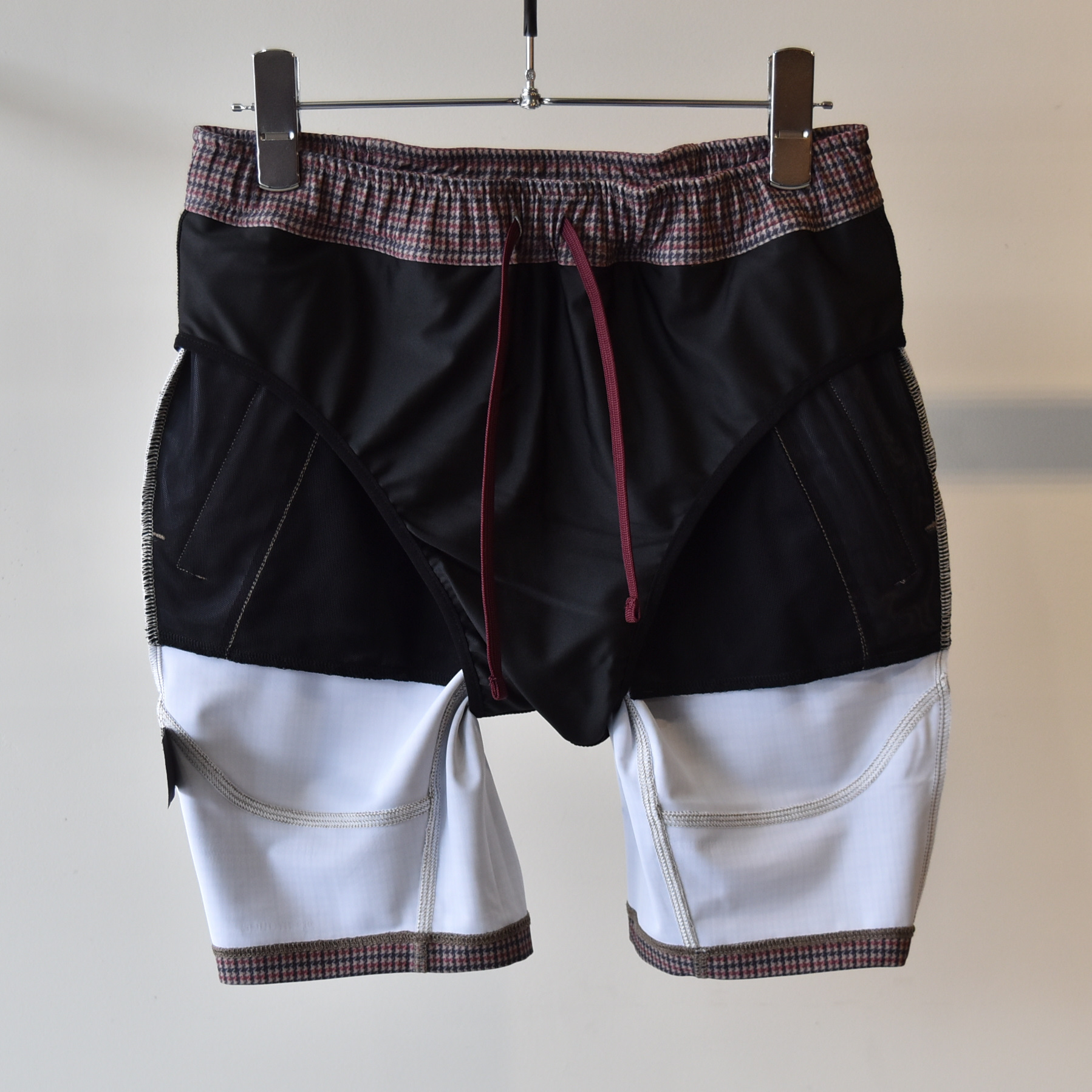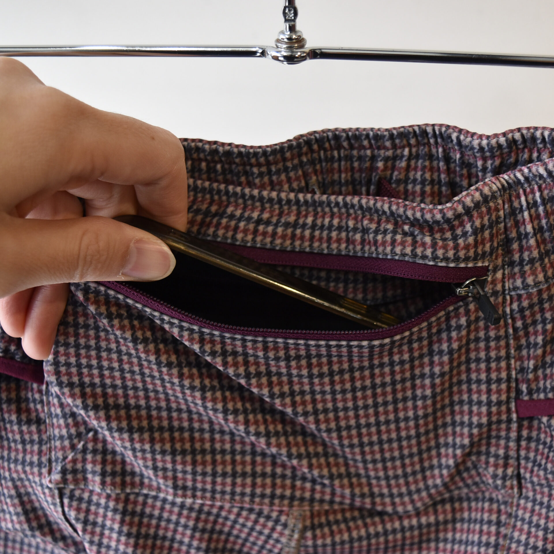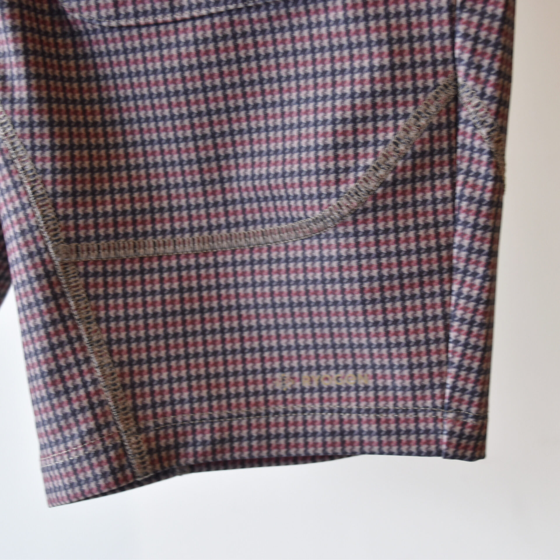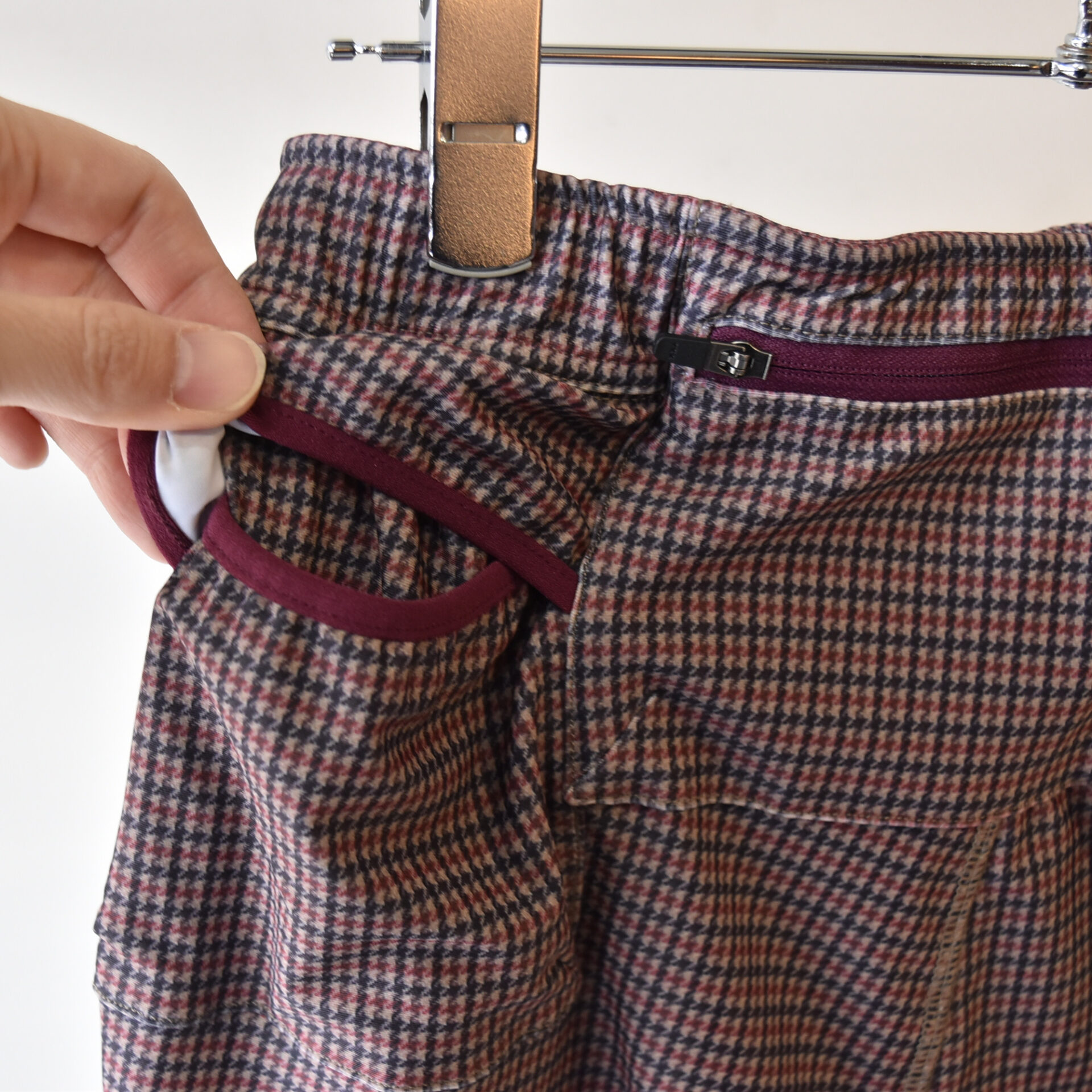 今シーズンはトラディショナルな雰囲気を醸し出すGUNCLUB CHECK柄を大胆に昇華プリント。有名水着メーカー採用の伸縮性あるニット素材をメインファブリックに使用し、タイツには見られない前面のマチ付きポケットを切り替えたドッキングタイツ。