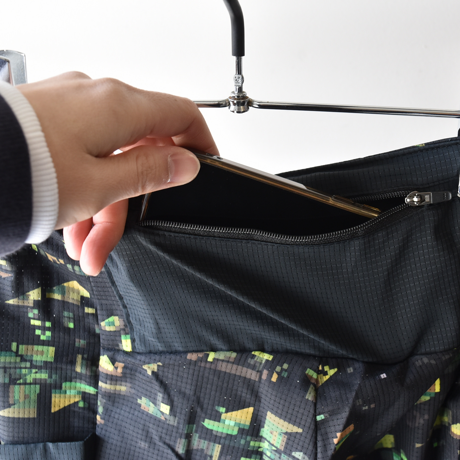 目を引くビッグポケットにはファスナー付きで小物の収納に便利。