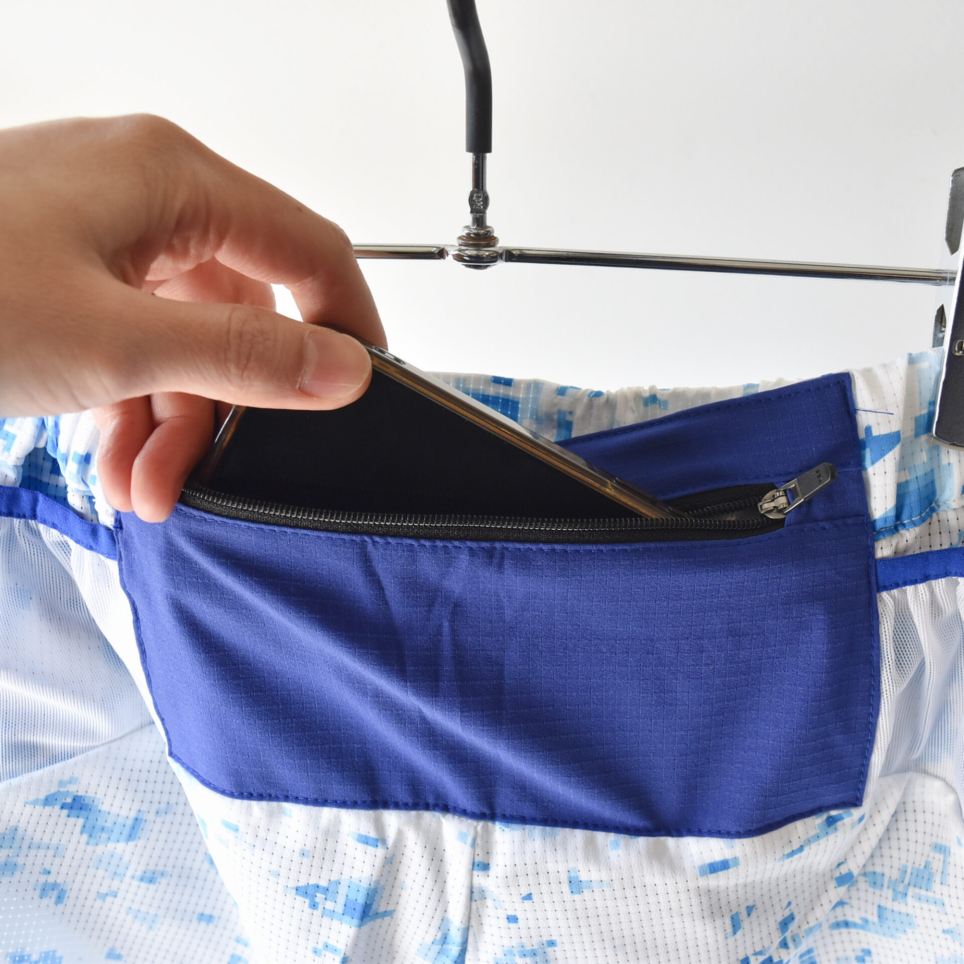 背面スマホポケット、両サイドメッシュポケット、フロントポケット×2の計5ポケットを装備。