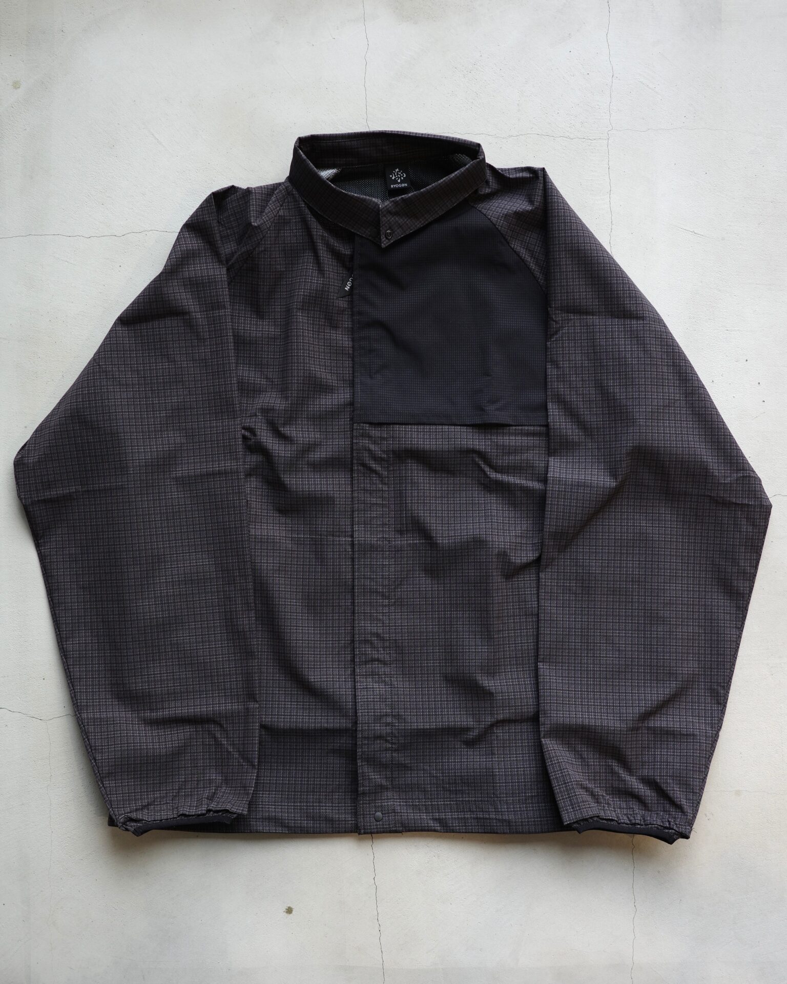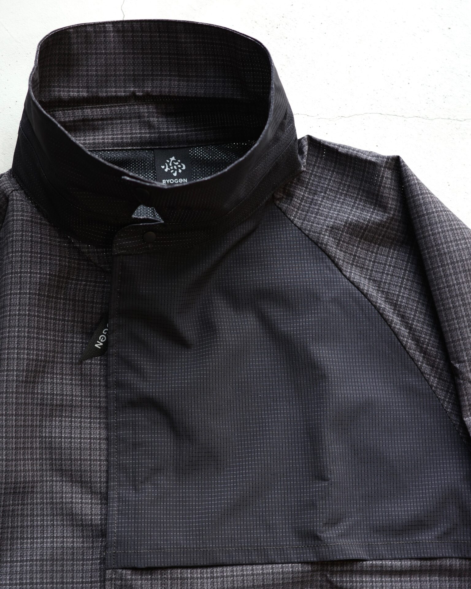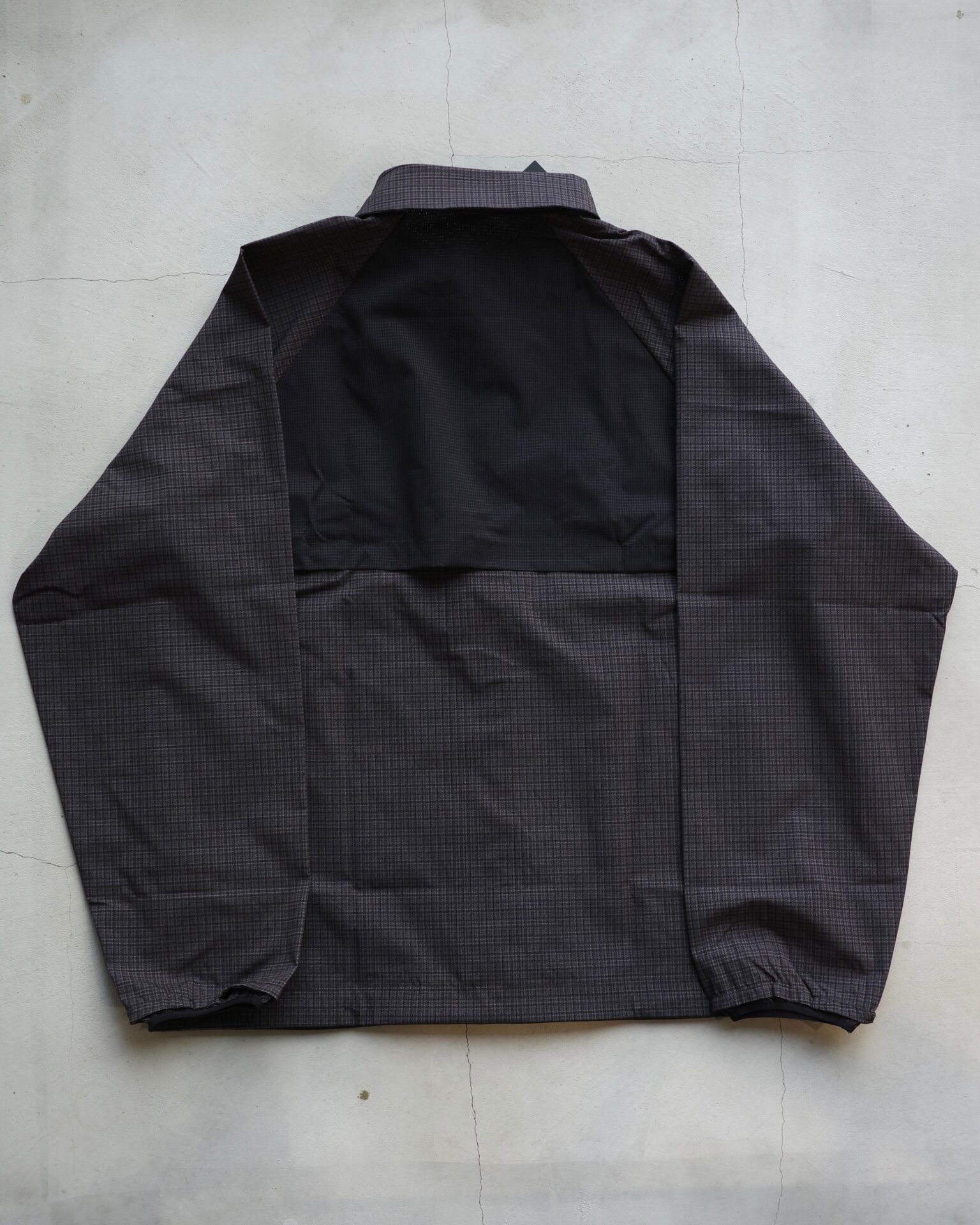 肩からアームにかけてストンと落ちるアパレルアイテム顔負けの美しいシルエット、背面ヨークにはメッシュ切替によるベンチレーション、襟を立てボタンを締めることで防風、など細かなディティールワークとは相反するスポーツウェア然としないオーバーサイズなボックスシルエット。
