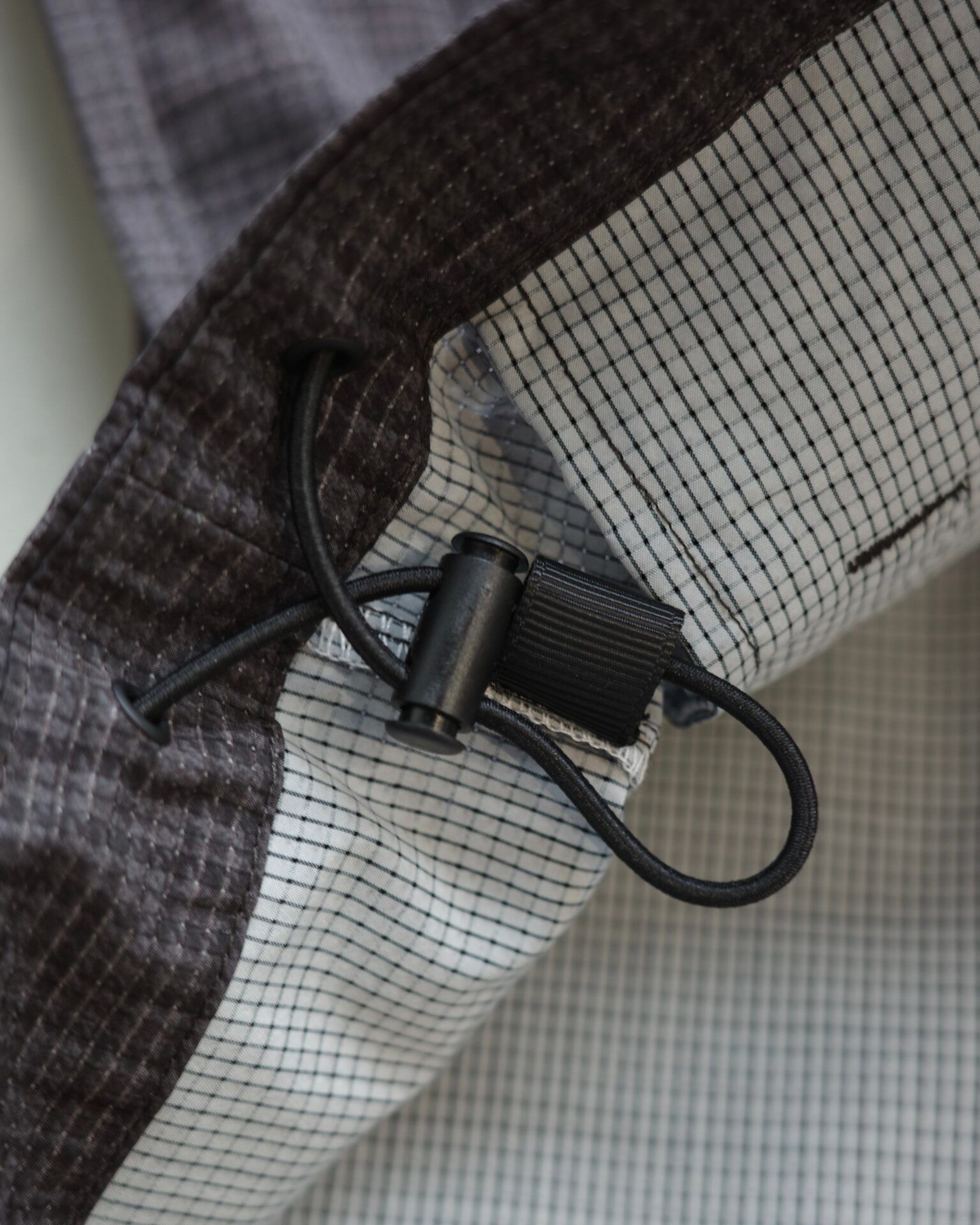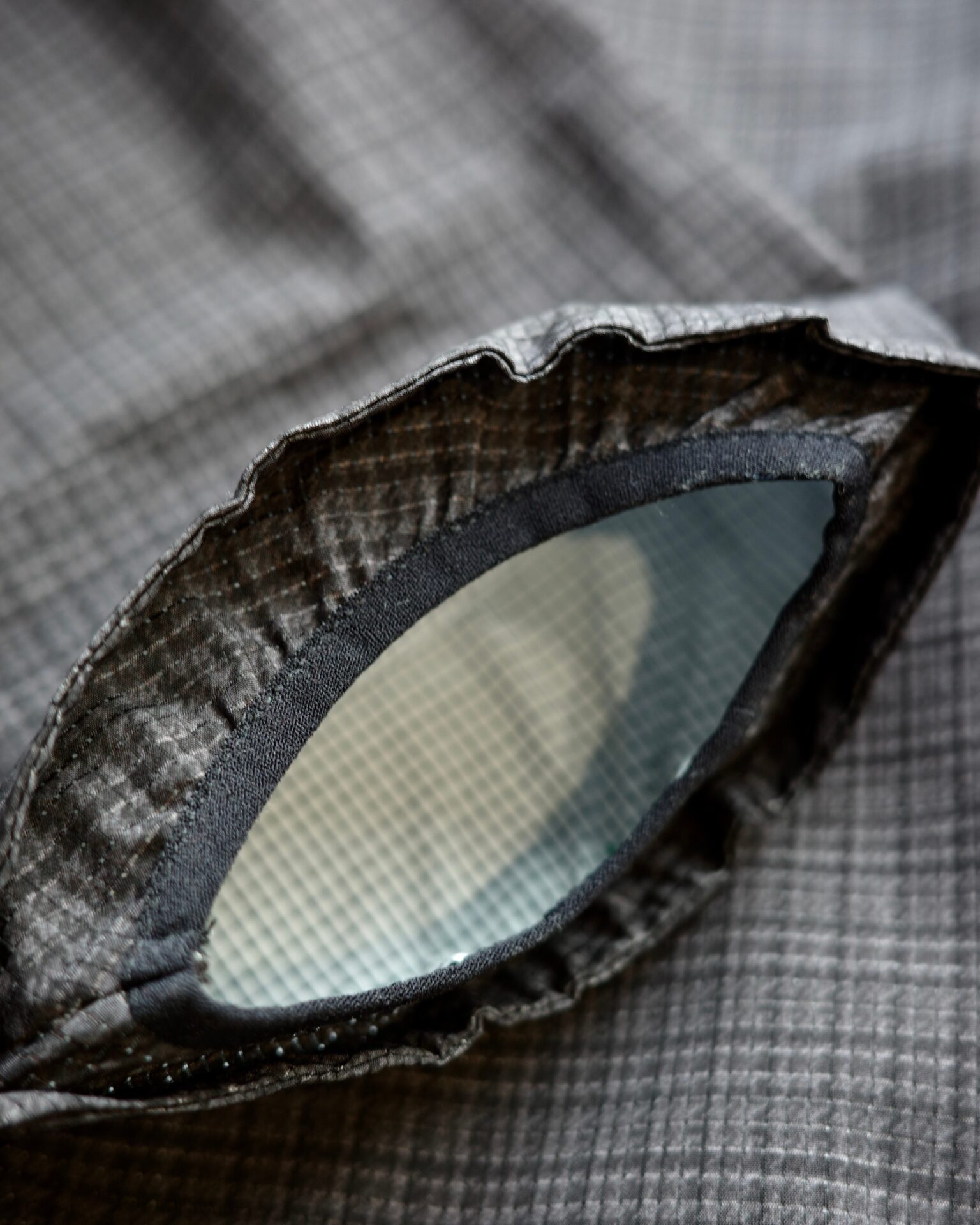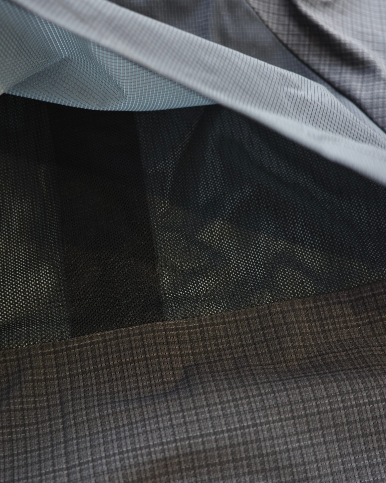 肩からアームにかけてストンと落ちるアパレルアイテム顔負けの美しいシルエット、背面ヨークにはメッシュ切替によるベンチレーション、襟を立てボタンを締めることで防風、など細かなディティールワークとは相反するスポーツウェア然としないオーバーサイズなボックスシルエット。