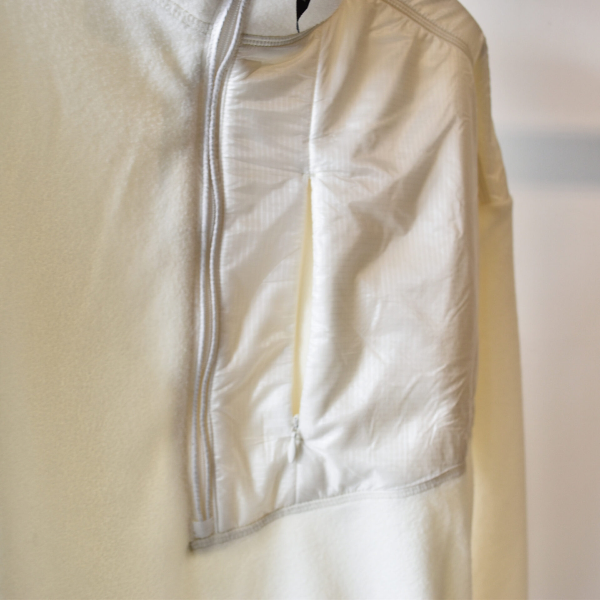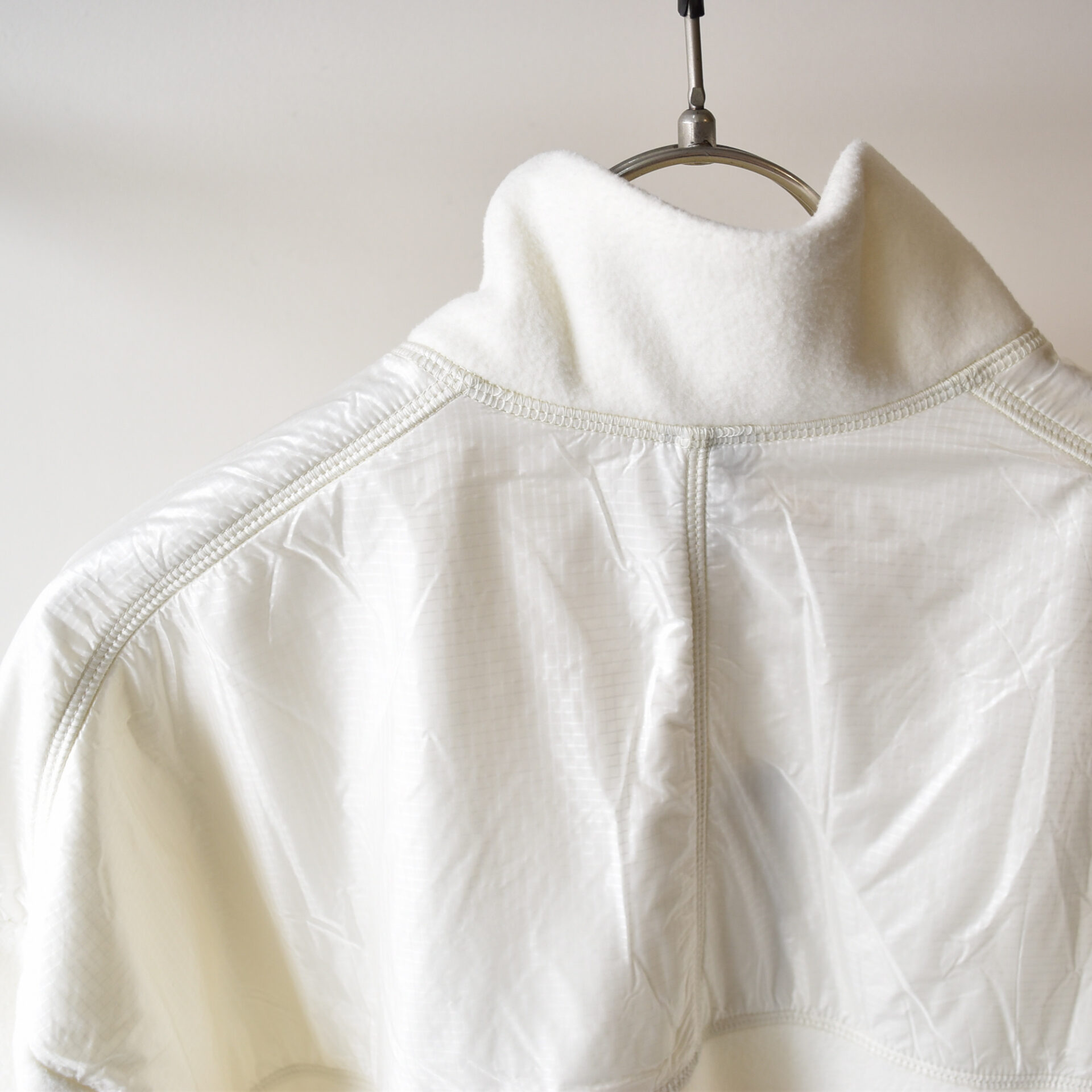 左身頃から肩にかけてナイロン素材で切り替えることで野暮ったいイメージのフリースにメリハリをプラス。