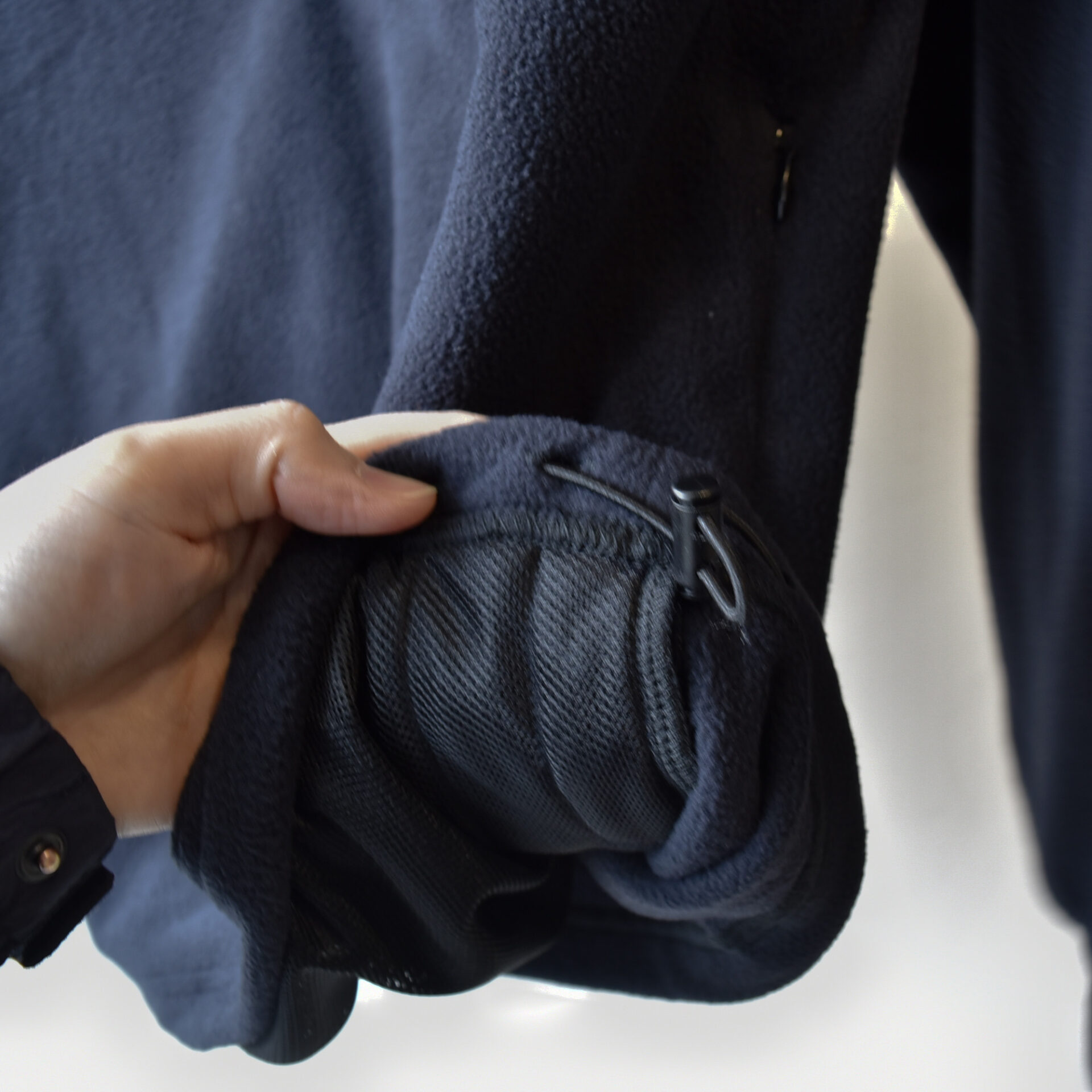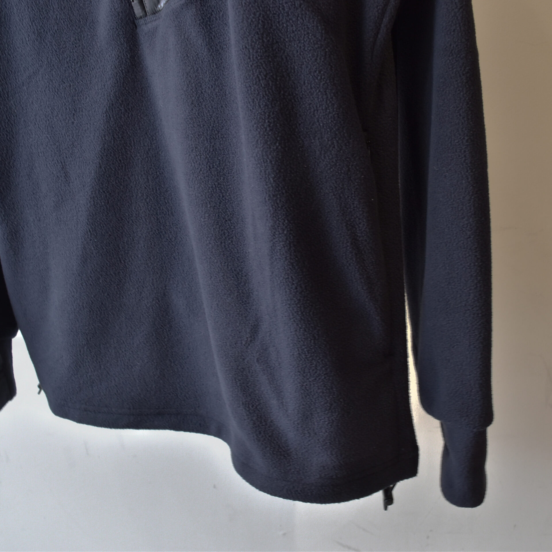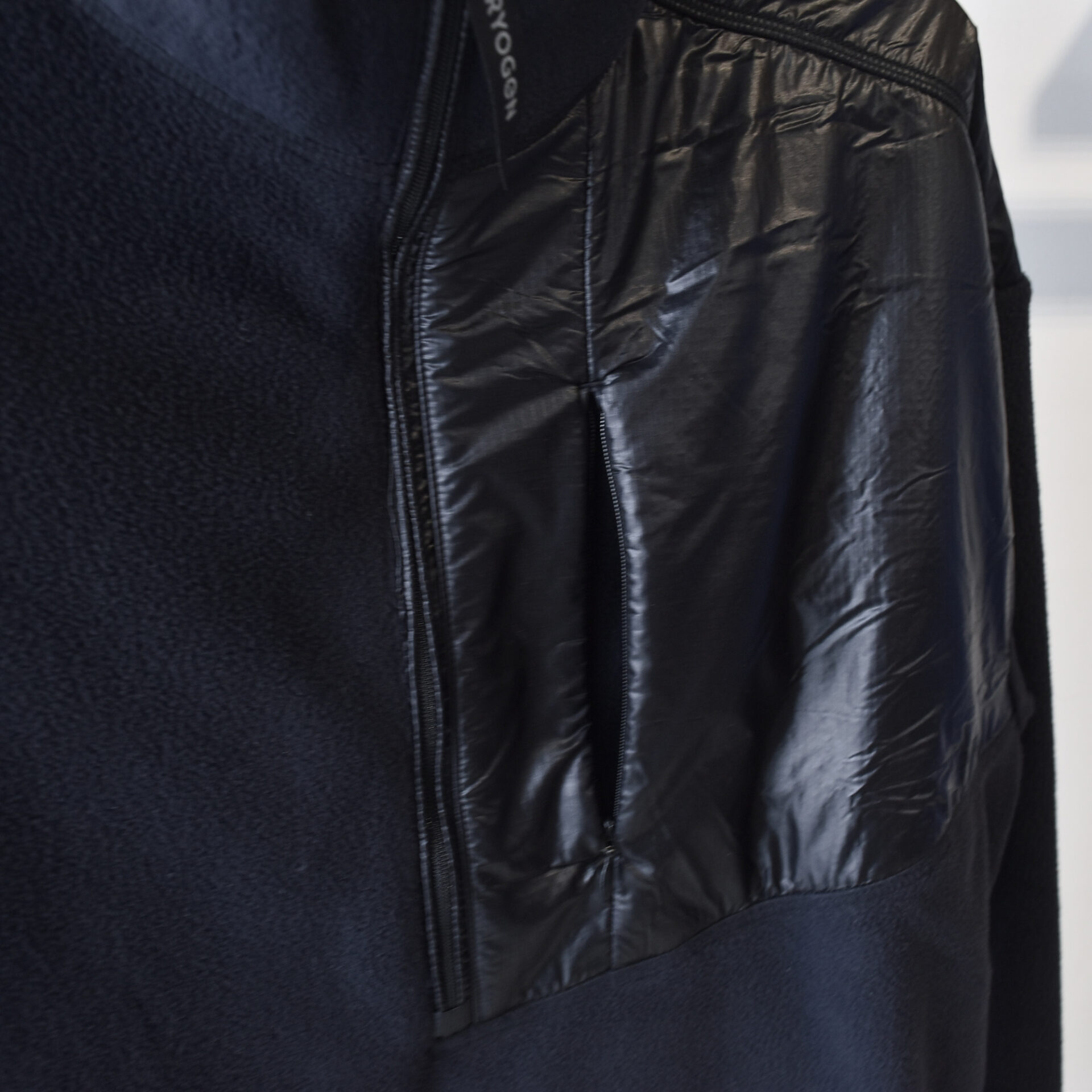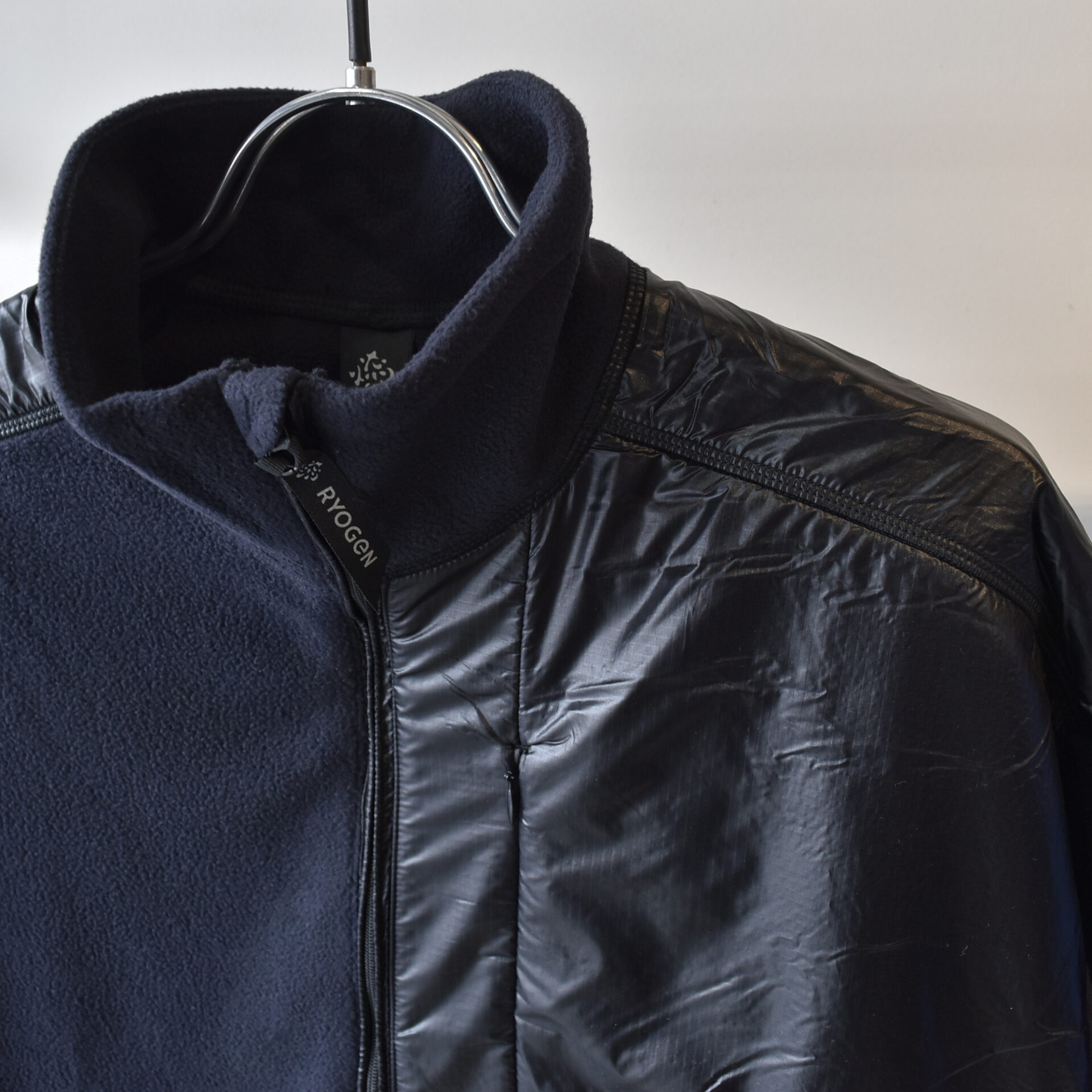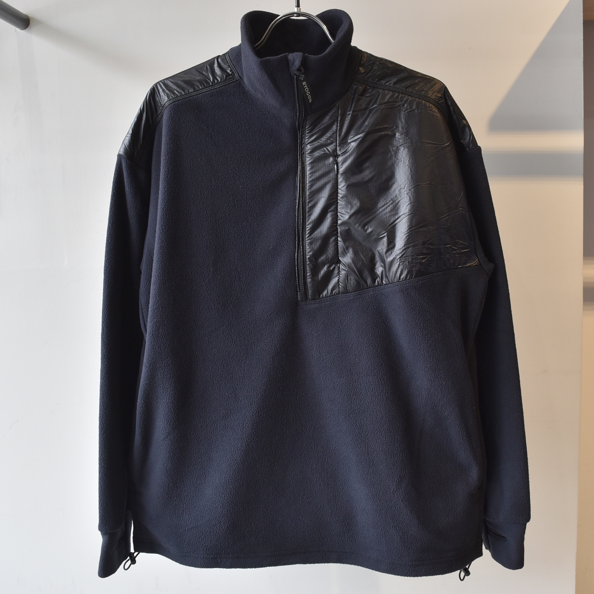 左身頃から肩にかけてナイロン素材で切り替えることで野暮ったいイメージのフリースにメリハリをプラス。