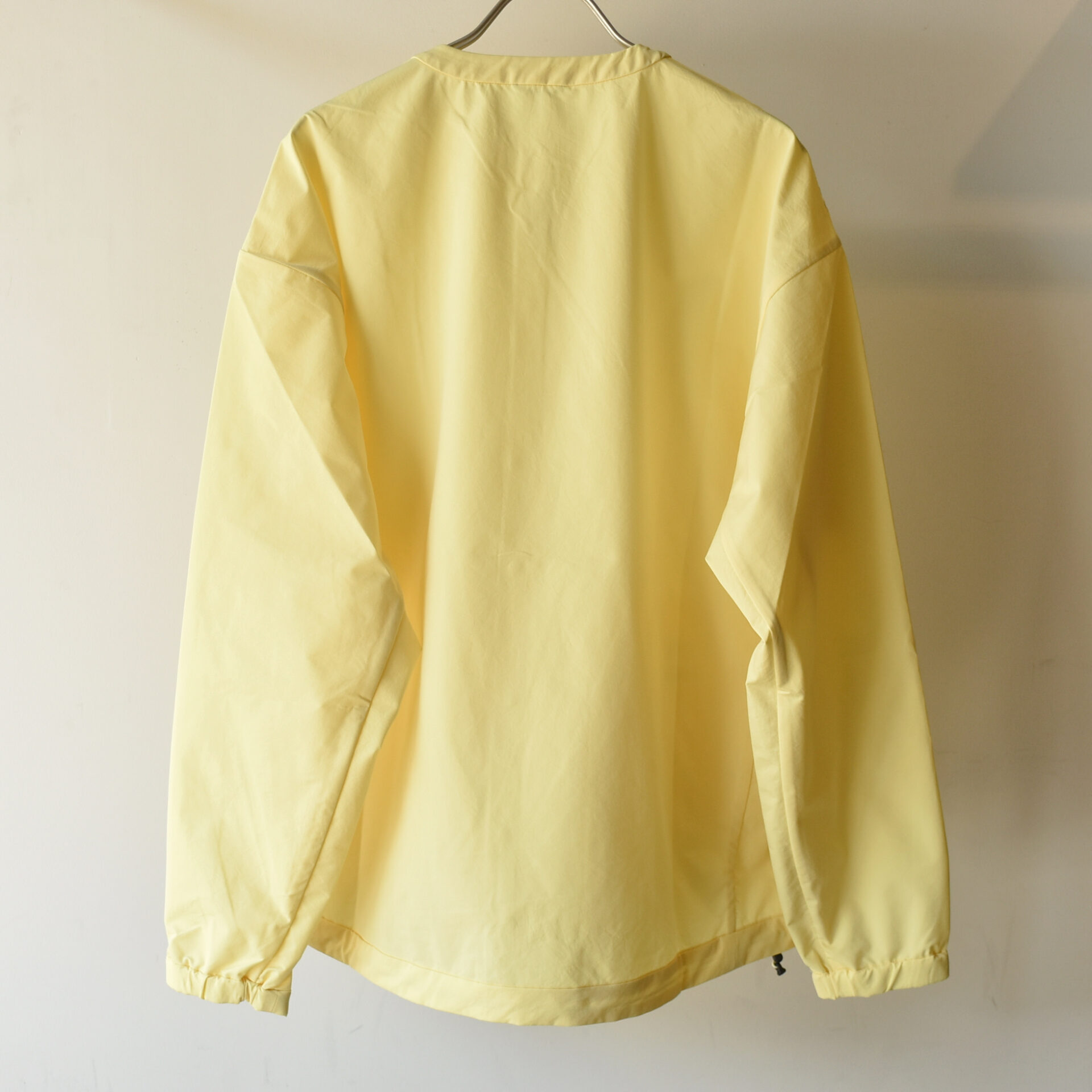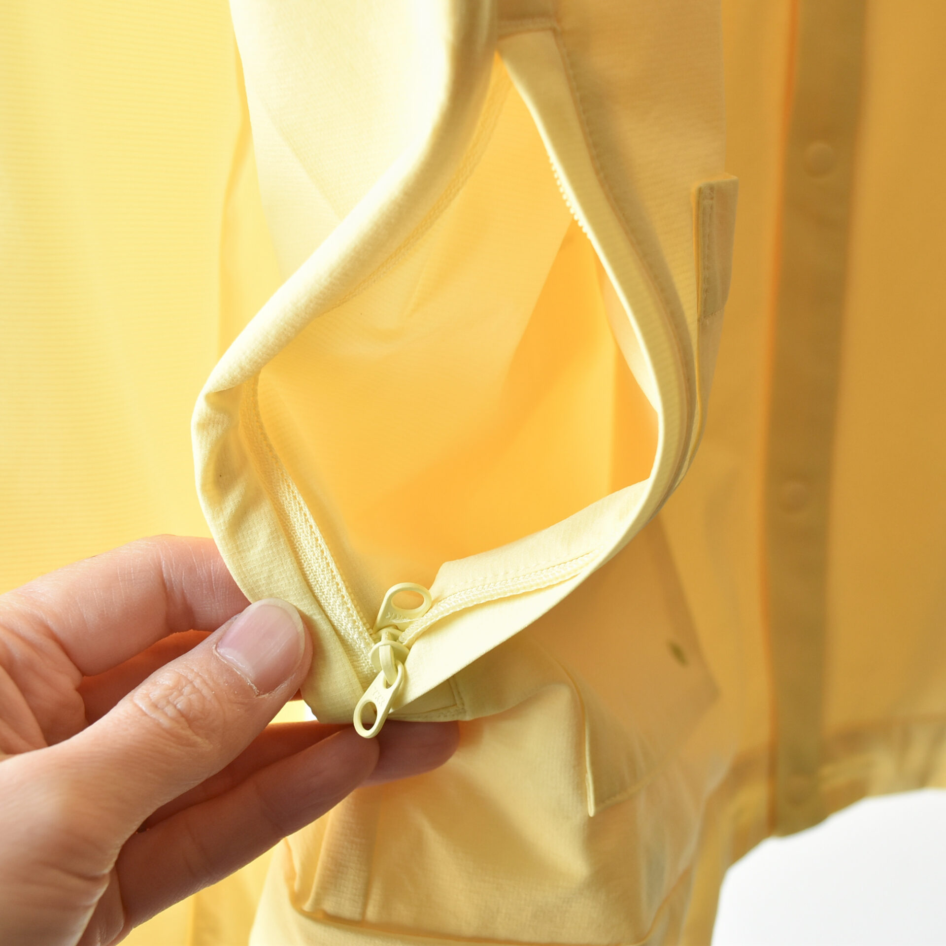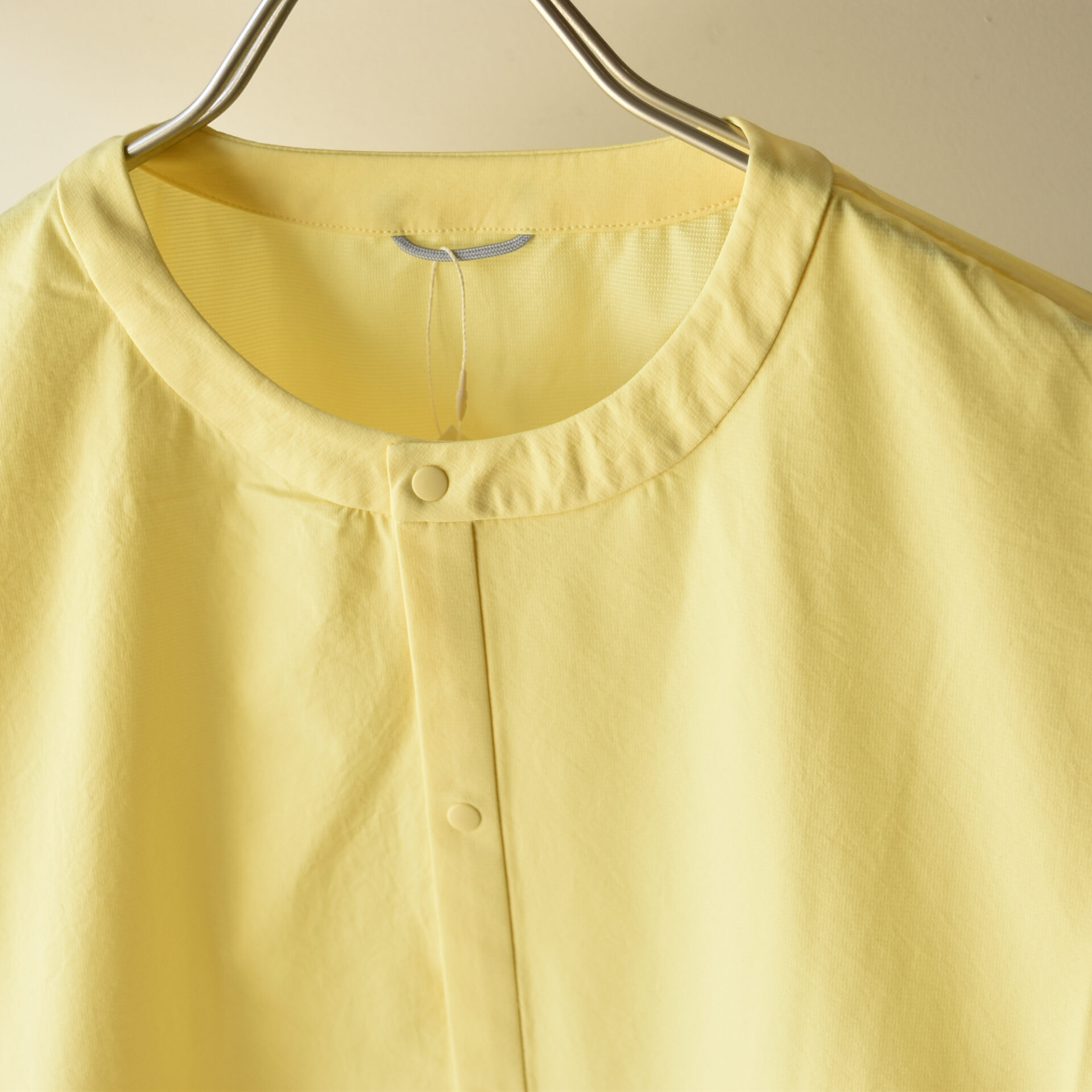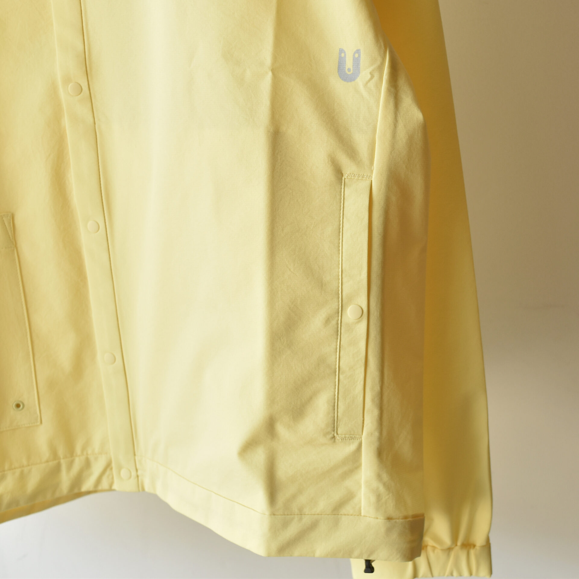 襟周りはシンプルな丸首タイプです。下にフード付きアイテムなんかを合わせても相性が良さそうです。ポケットはフロントに1つパッチポケットがあって、例えばジェルなんかをさっと取り出すことが可能です。サイドにはジッパー付きポケットとスナップボタン付きポケットが付属します。ジッパー付きの方は、パッカブル仕様となっていまして、携帯するのにも便利です。