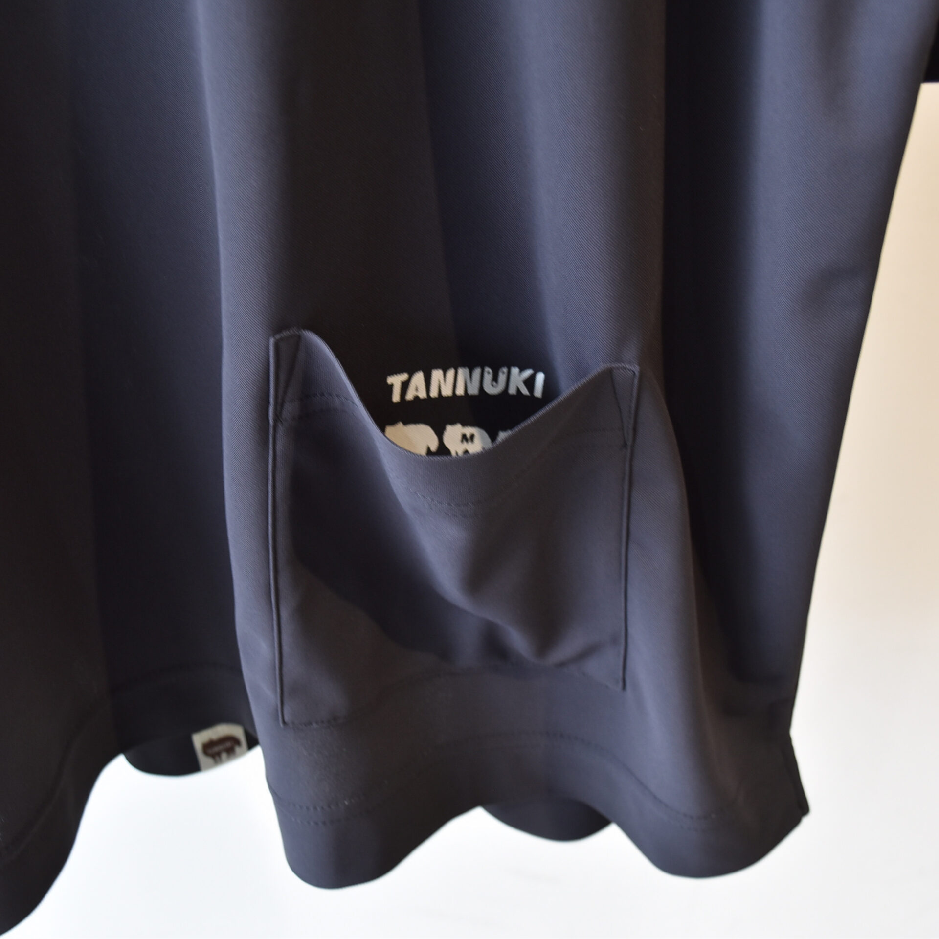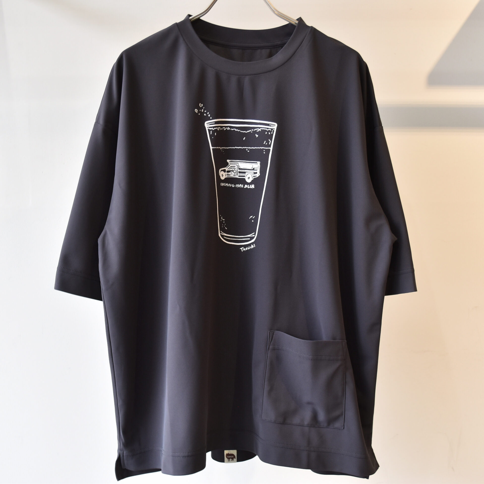 シルエットは、少し大きめ、というわけではなくしっかりとビッグシルエットなTシャツになっています。見た目はほっこりと丸みあるかわいらしさもある感じです。日常着として着てもらって、そのまま走りだしてほしいです。ポケットが左裾に付いています(ポケットの内側にはサイズ表記を兼ねたタヌキが潜んでいます)。