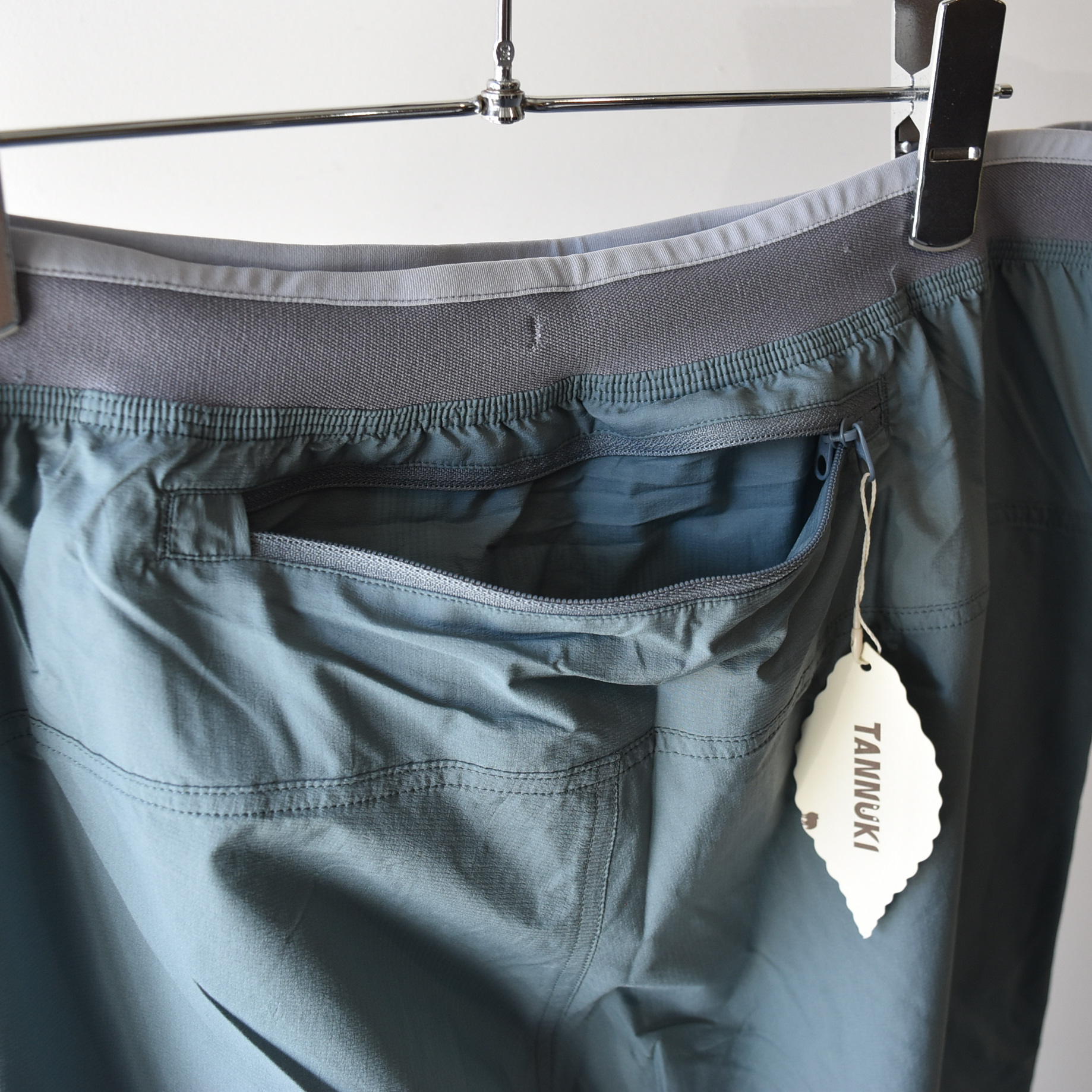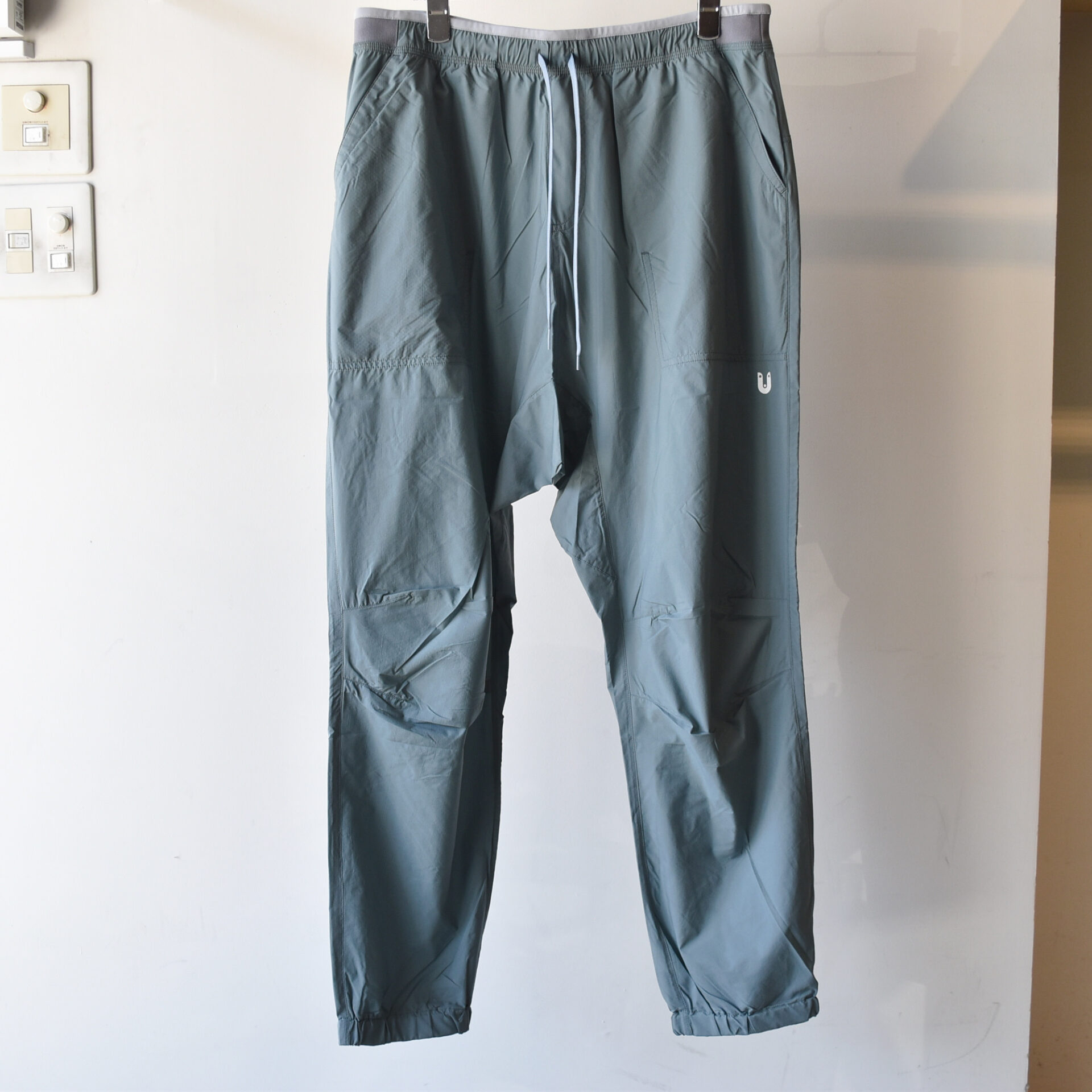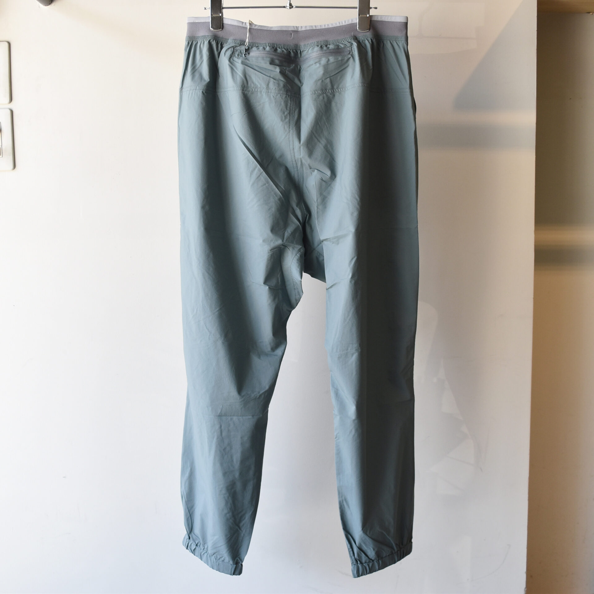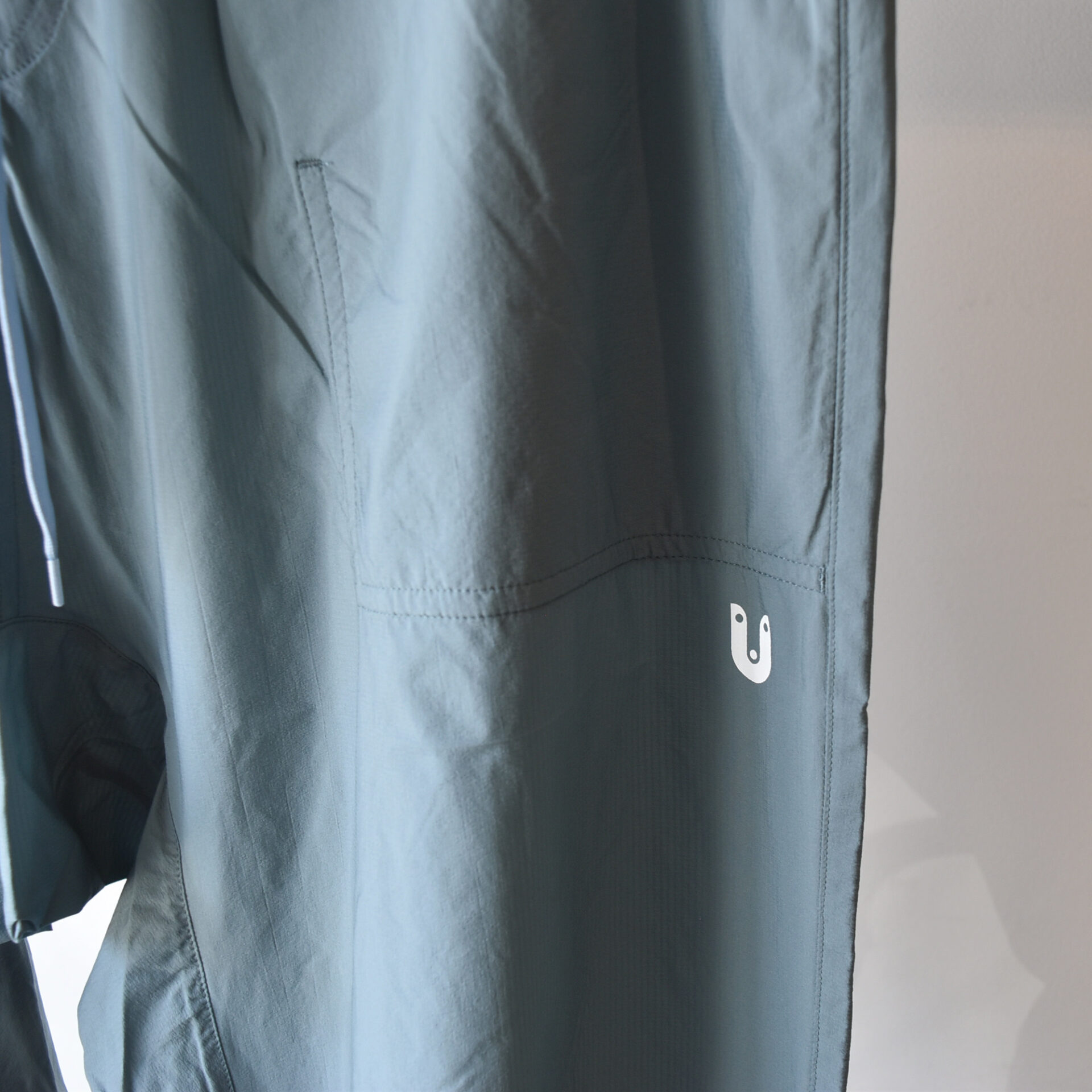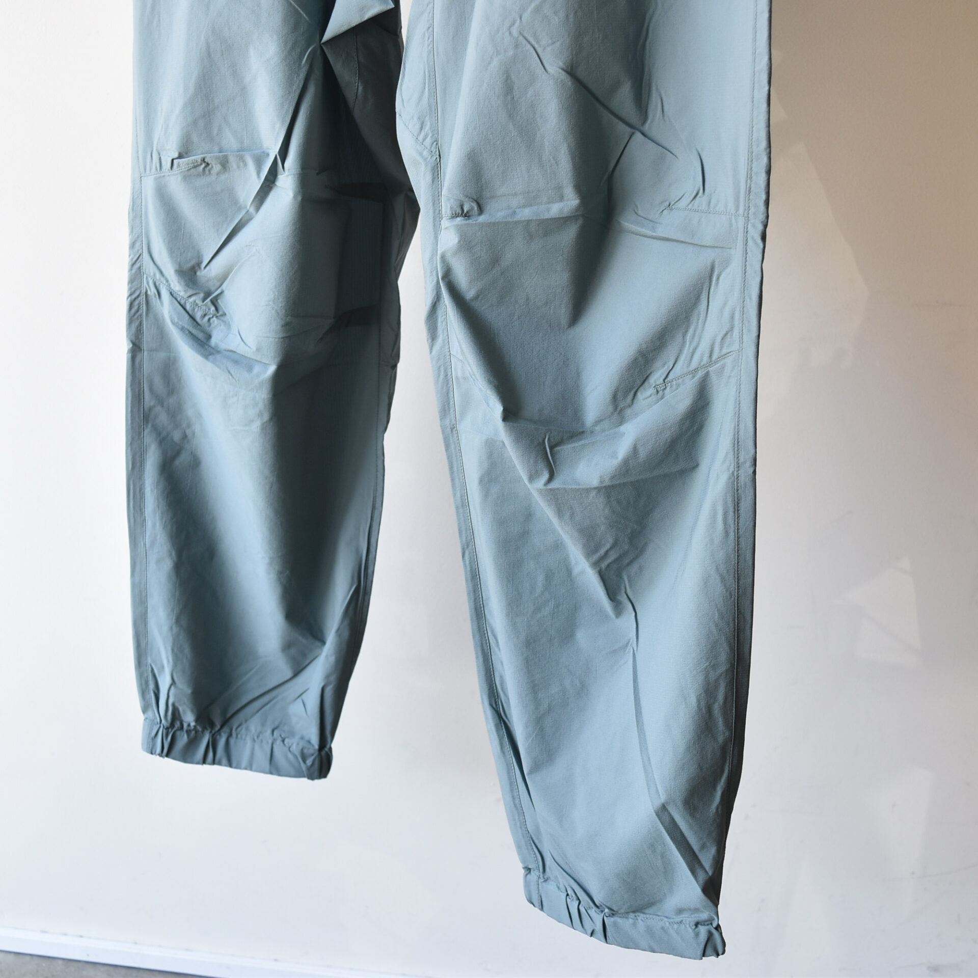 今回のTANNUKIのウィンドパンツでは、特に股上と太もも周りにゆとりを持たせ、裾に向かってテーパードさせるサルエル風のシルエットを採用しています。