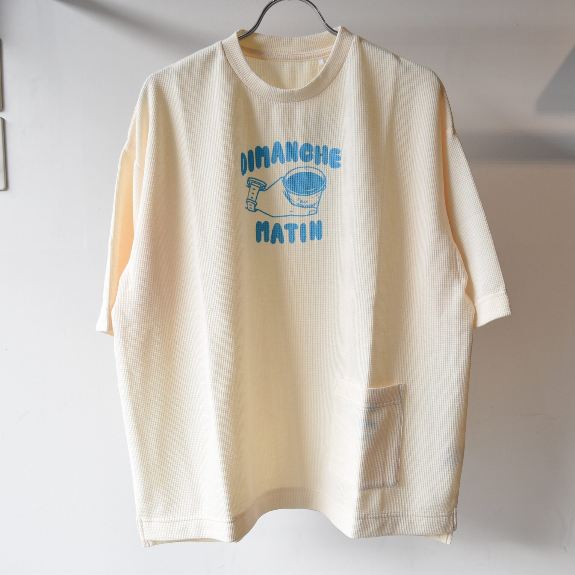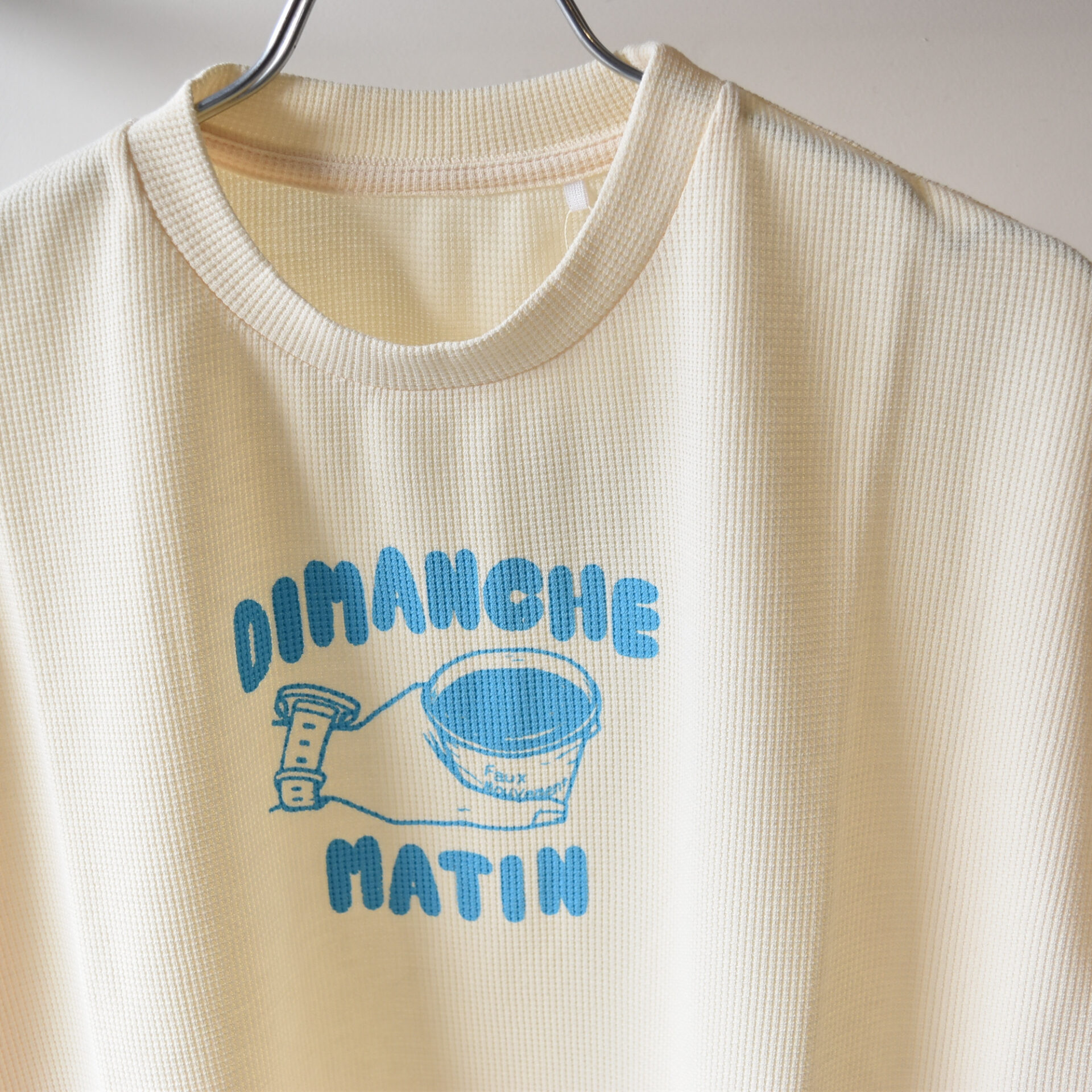 【Dimanche Matin】の文字が優しいブルーで前面にプリントされています。このブルーカラーとボディのクリームカラーの相性もとても良い感じです。Dimanche Matinはフランス語で「日曜日の朝」という意味。日曜の朝にグループでランニングしてその後コーヒーを飲むイメージがグラフィックとなっています。コーヒーカップには店名であるFaux Mouvementの文字が控えめに入ります。マヒナさんはその日曜日の朝の風景をアニメーションにも落としてくれていますのでそちらもぜひご覧いただけたらと思います(写真ご参照ください)。