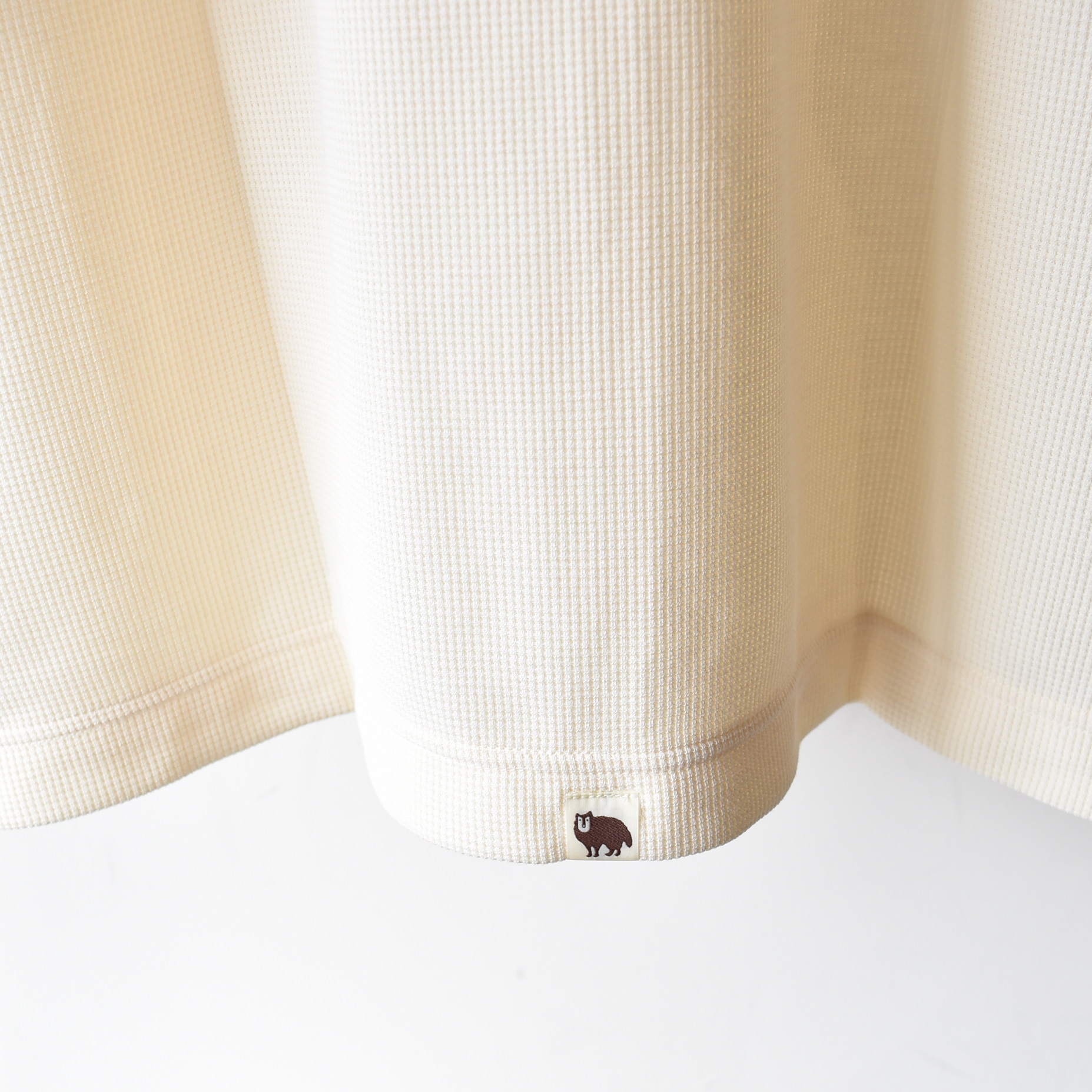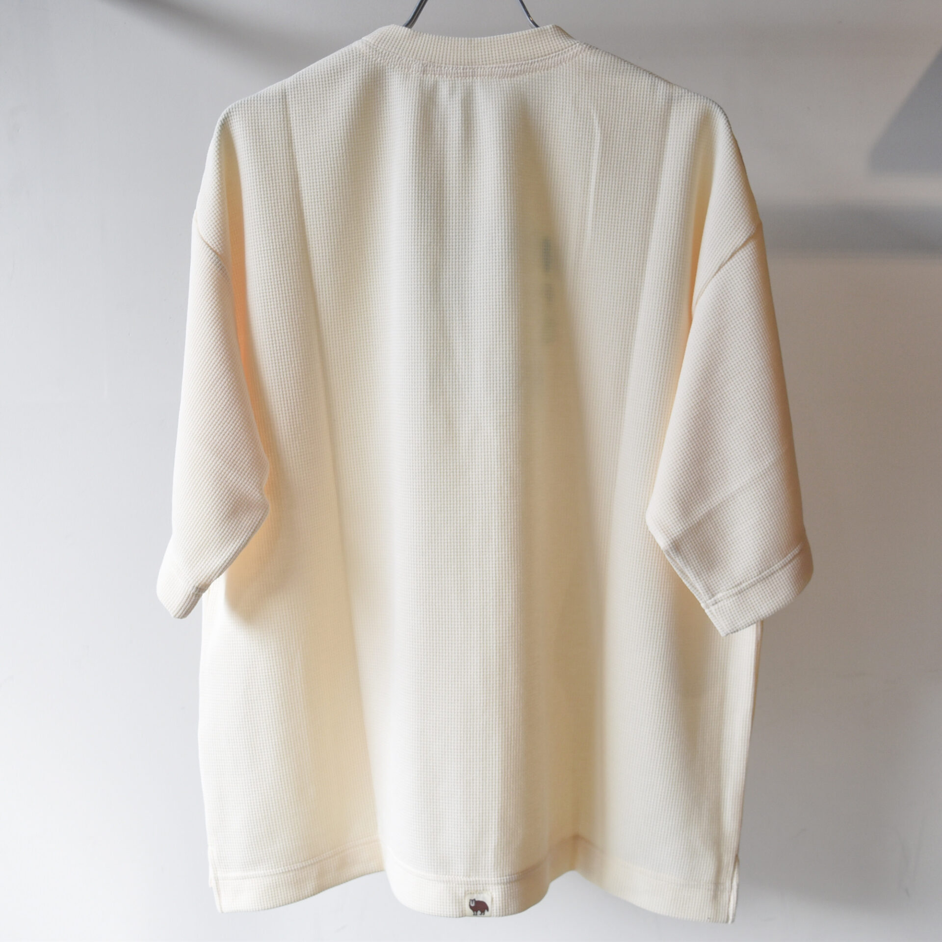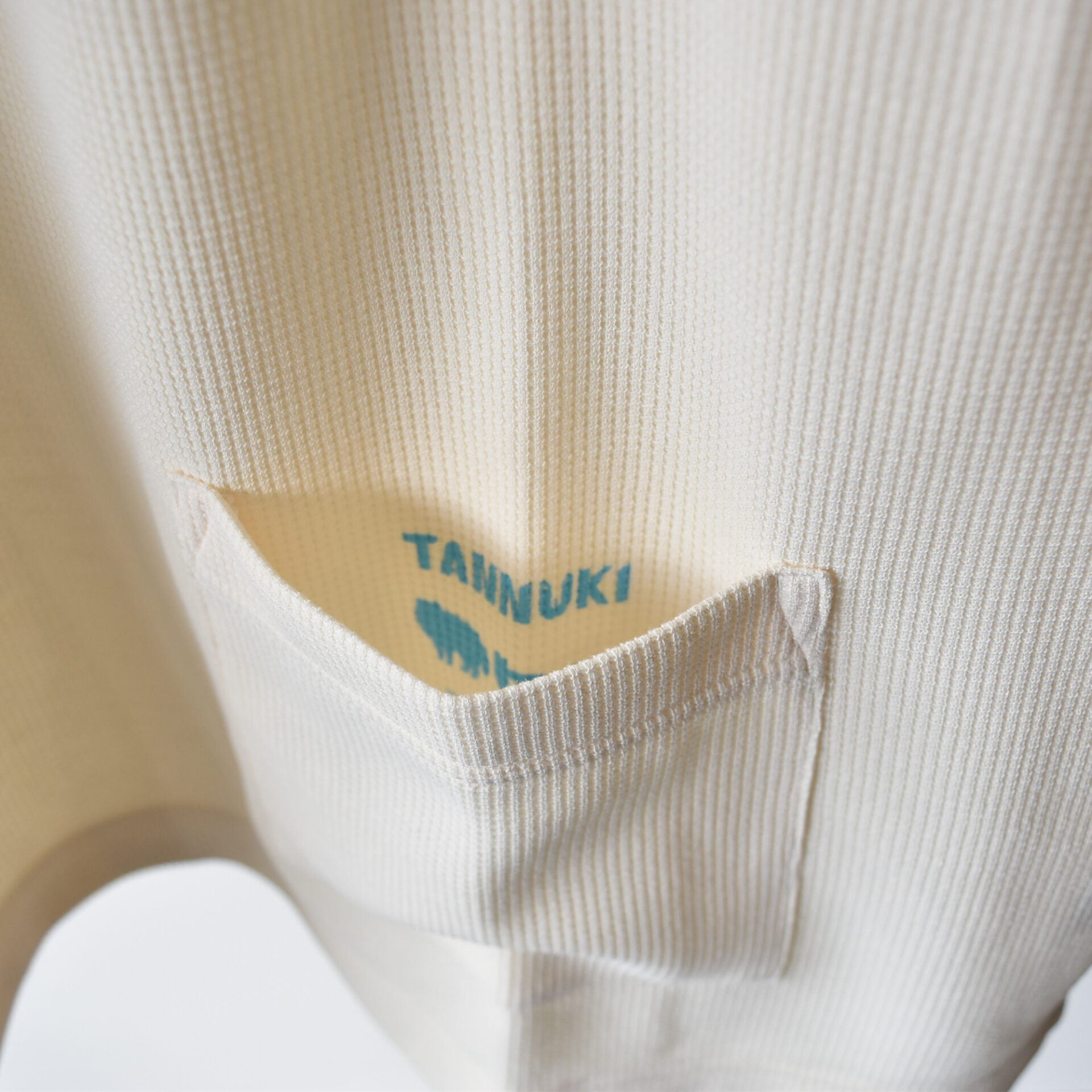 ワッフル素材の名前の由来はお菓子のワッフルから。ワッフルのように表面にマス目状の凹凸感のあるのが特徴です。凸凹によって肌にあたる面積が小さくなることでさらっとドライに着ていただけます。タオルやシーツなんかにワッフル素材が多く使われてきたのもその肌当たりの良さからです。構造上の利点が色々とありまして、糸と糸との間に空間があることから、吸水性、通気性、柔軟性に優れます。