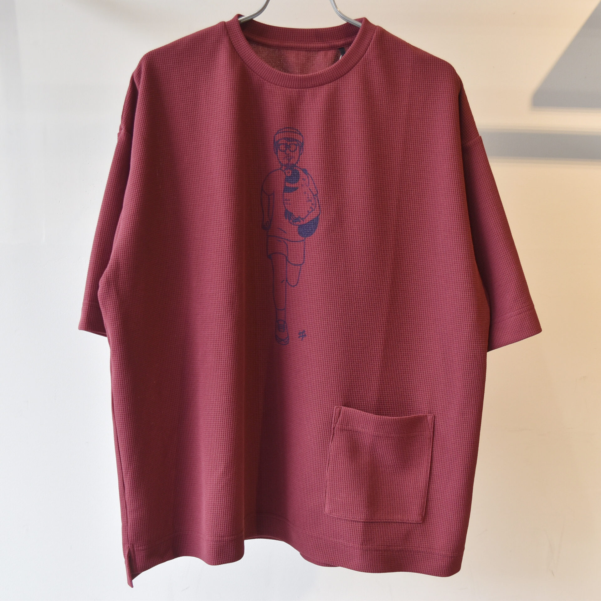 シルエットは、少し大きめ、というわけではなくしっかりとビッグシルエットなTシャツになっています。見た目はほっこりと丸みあるかわいらしさもある感じです。日常着として着てもらって、そのまま走りだしてほしいです。ポケットが左裾に付いています(ポケットの内側にはサイズ表記を兼ねたタヌキが潜んでいます)。