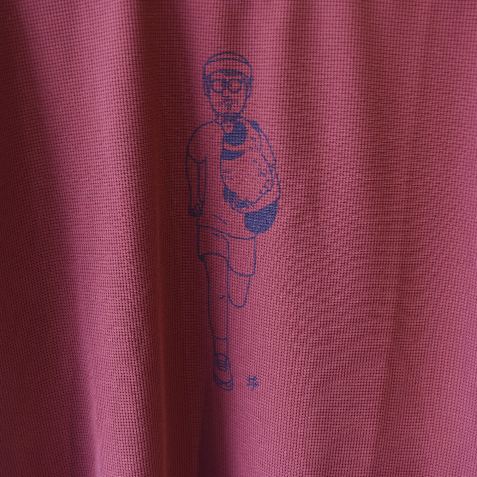 デザインと素材が生み出す風をまとう感覚。そんな着心地のTシャツです。身体にフィットさせるのではなく、あえて身体と服の間に隙間を作る、そのデザインと素材の持つドライな風合い、軽さによって身体の周りを風がかけぬける感覚を楽しめます。パフォーマンスを追求するというよりランニングを感覚的に楽しむ、そんな風に着ていただけたらと思っています。