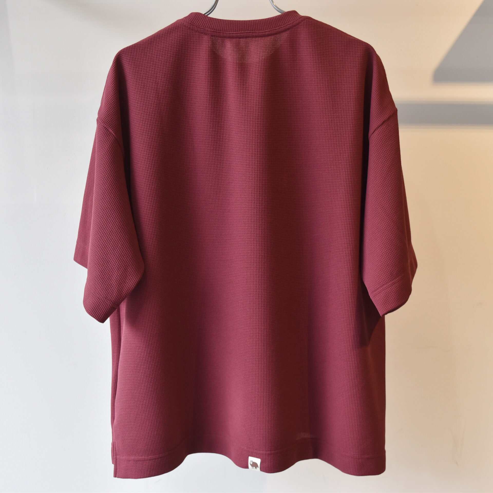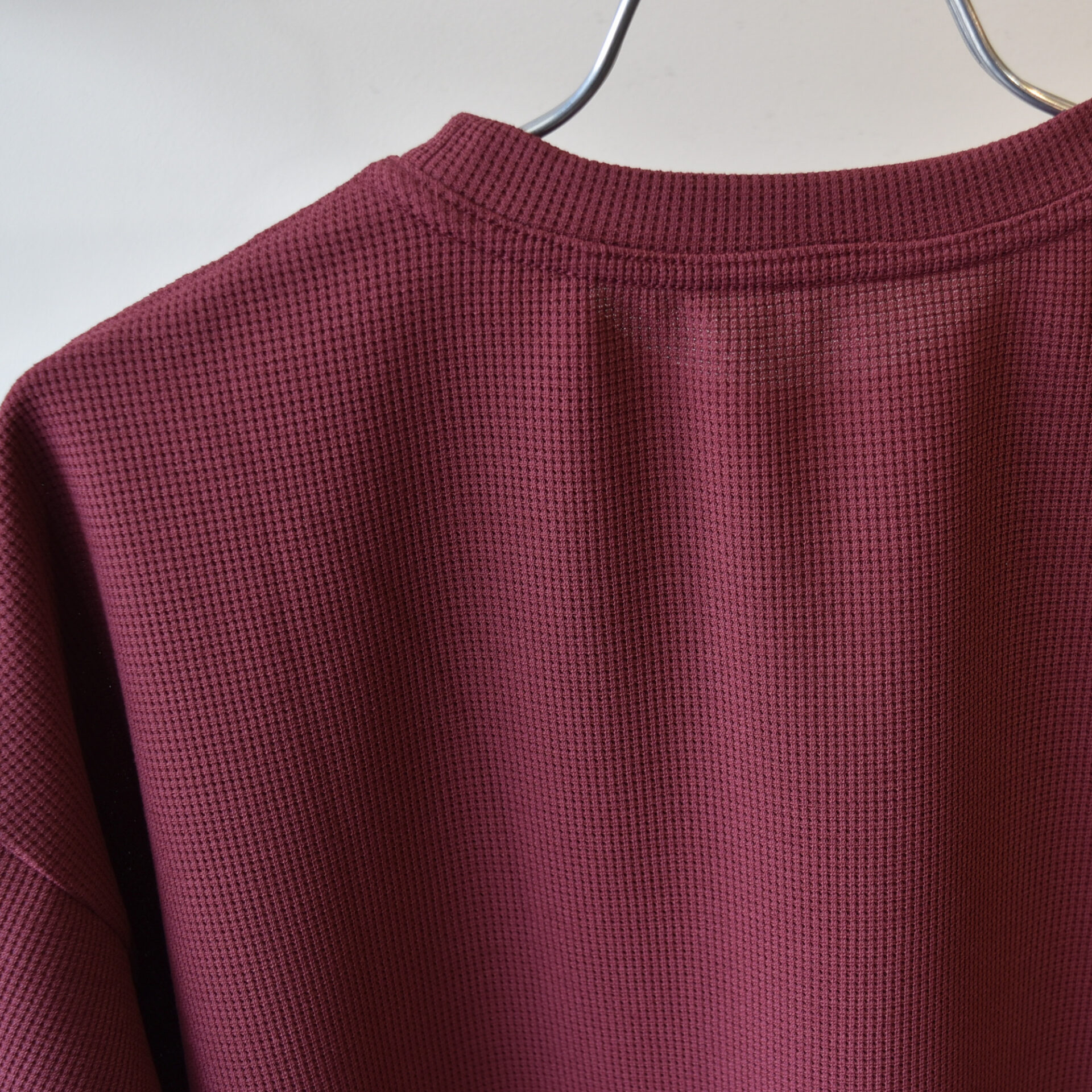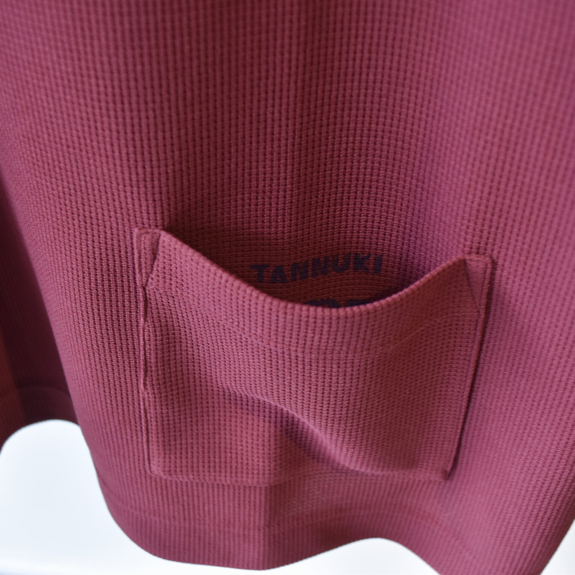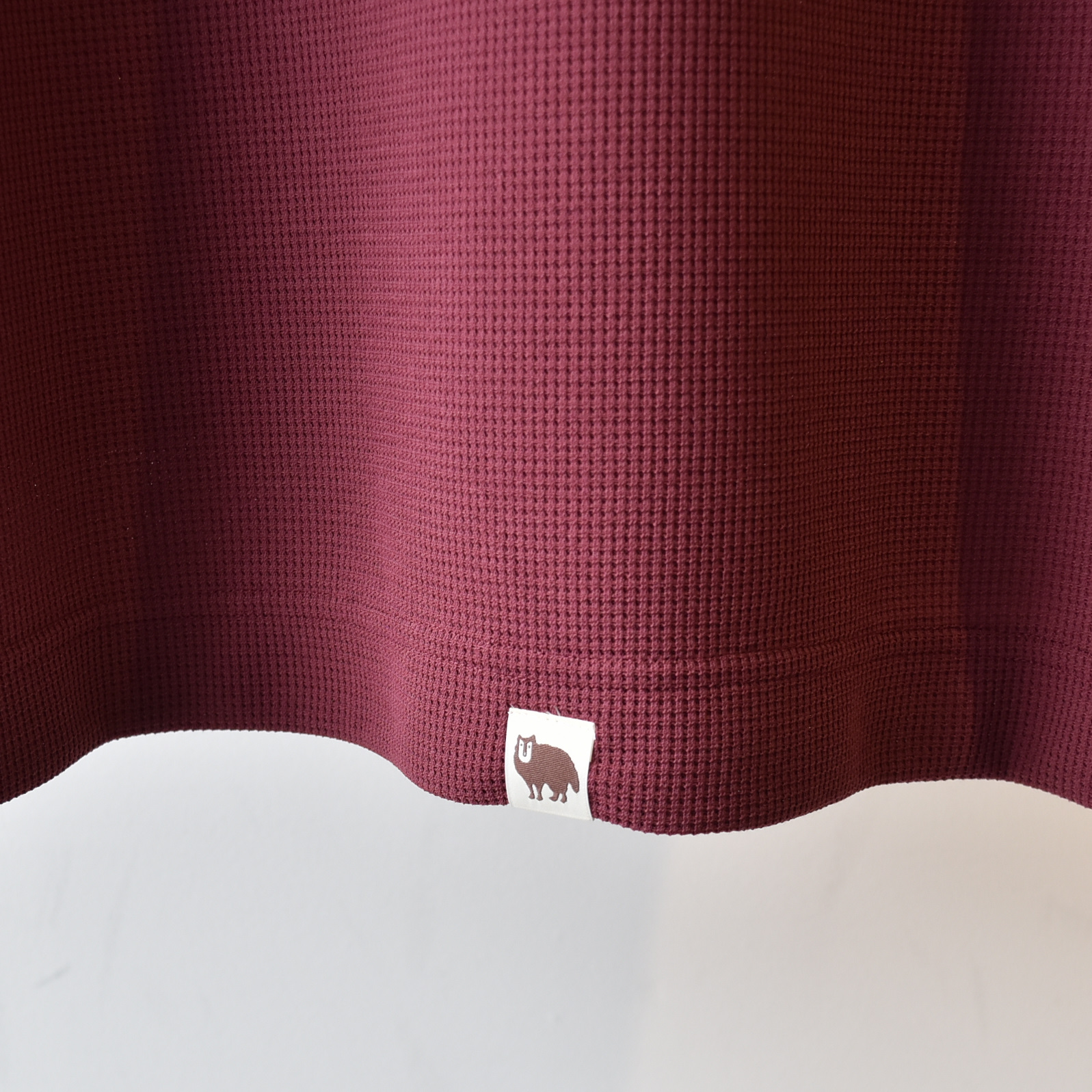 ワッフル素材の名前の由来はお菓子のワッフルから。ワッフルのように表面にマス目状の凹凸感のあるのが特徴です。凸凹によって肌にあたる面積が小さくなることでさらっとドライに着ていただけます。タオルやシーツなんかにワッフル素材が多く使われてきたのもその肌当たりの良さからです。構造上の利点が色々とありまして、糸と糸との間に空間があることから、吸水性、通気性、柔軟性に優れます。