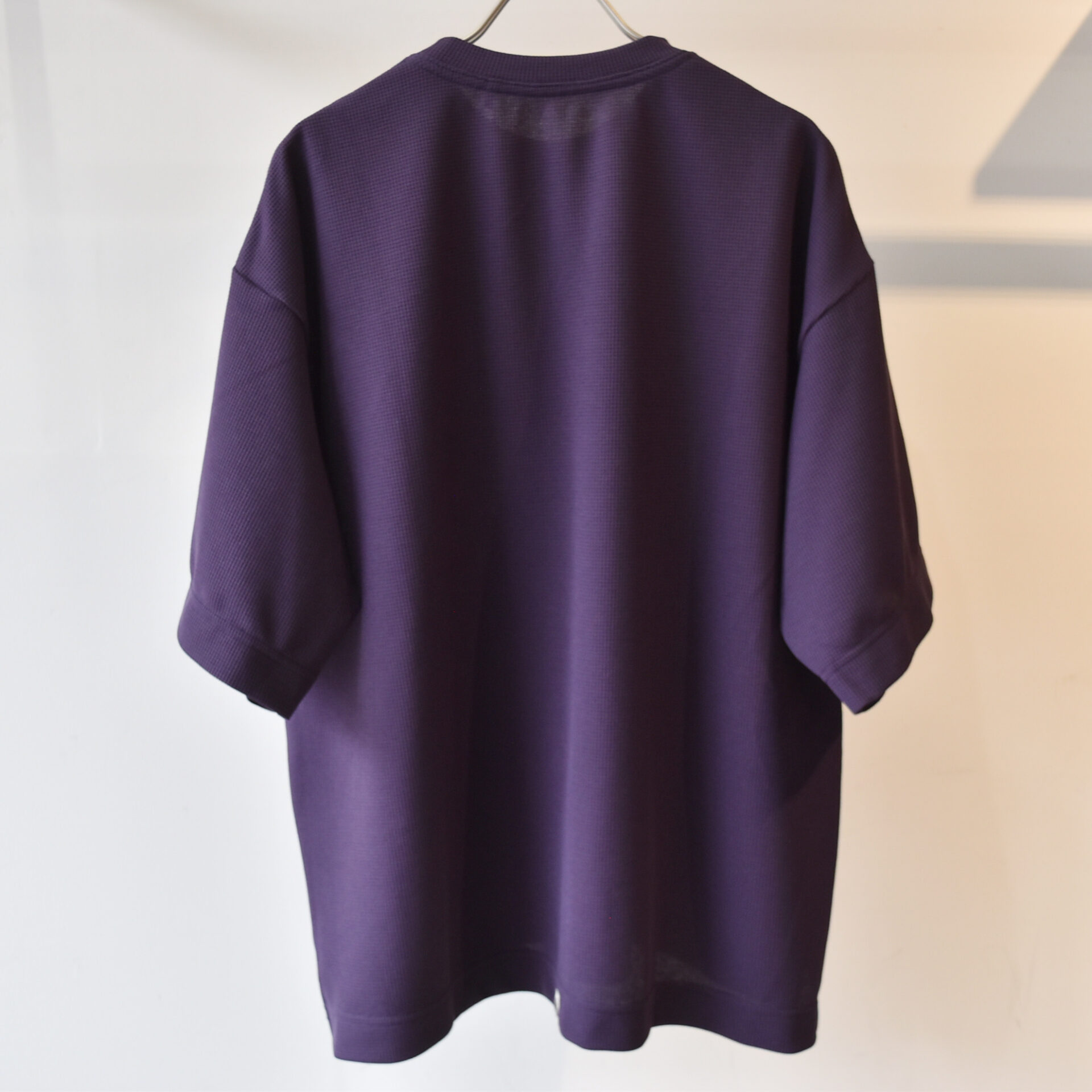 ワッフル素材の名前の由来はお菓子のワッフルから。ワッフルのように表面にマス目状の凹凸感のあるのが特徴です。凸凹によって肌にあたる面積が小さくなることでさらっとドライに着ていただけます。タオルやシーツなんかにワッフル素材が多く使われてきたのもその肌当たりの良さからです。構造上の利点が色々とありまして、糸と糸との間に空間があることから、吸水性、通気性、柔軟性に優れます。