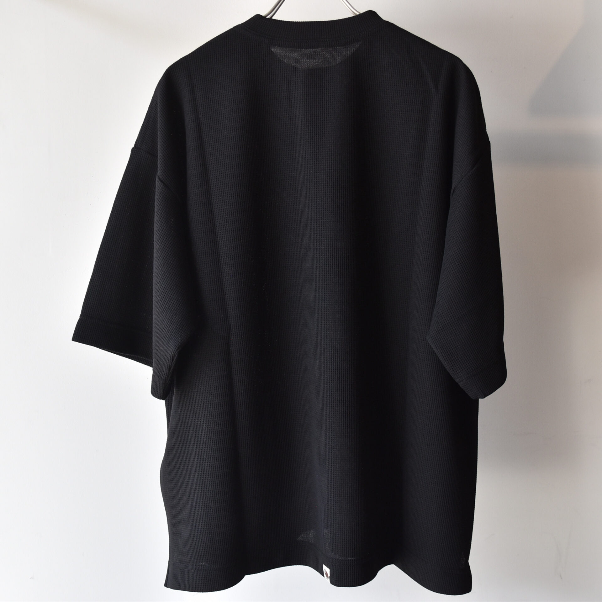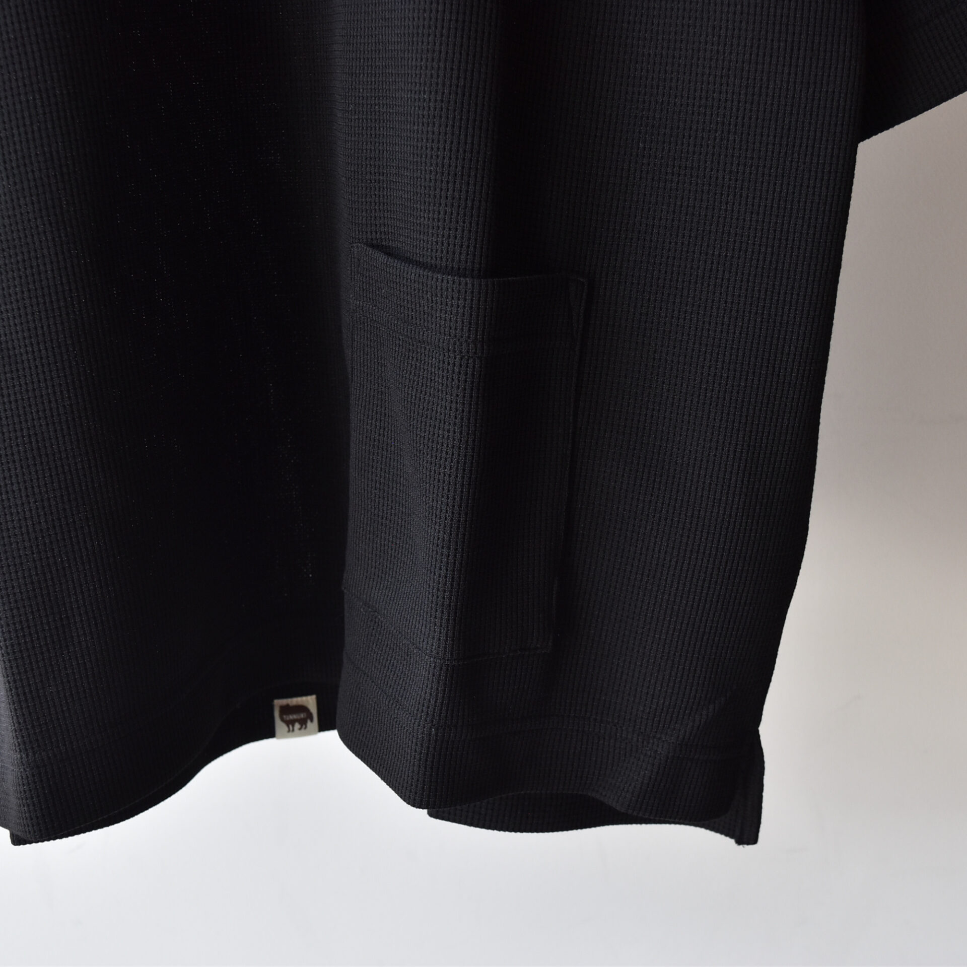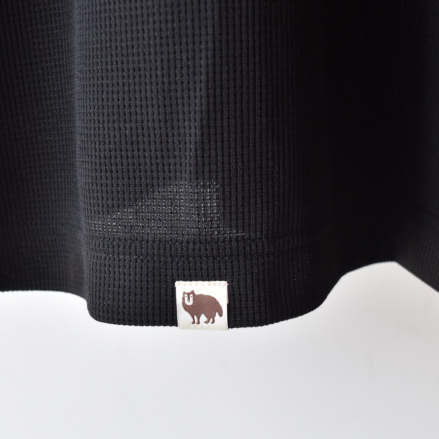 ワッフル素材の名前の由来はお菓子のワッフルから。ワッフルのように表面にマス目状の凹凸感のあるのが特徴です。凸凹によって肌にあたる面積が小さくなることでさらっとドライに着ていただけます。タオルやシーツなんかにワッフル素材が多く使われてきたのもその肌当たりの良さからです。構造上の利点が色々とありまして、糸と糸との間に空間があることから、吸水性、通気性、柔軟性に優れます。